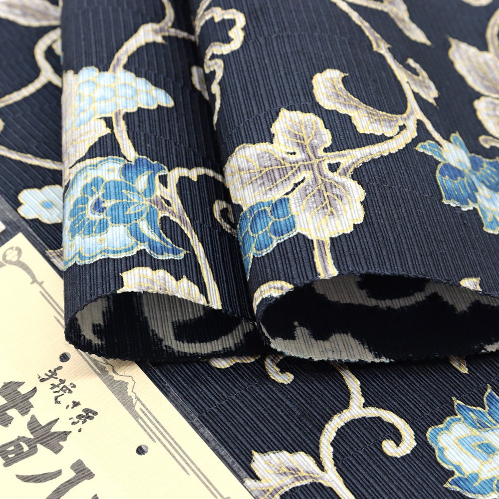 地織りの凹凸が特徴的な織地と、【岡重】の美麗な染め柄が融合した重厚感のある仕上がりに。縁のゴールドが繊細な柄行きを沈ませず、華やかに引き立てます。