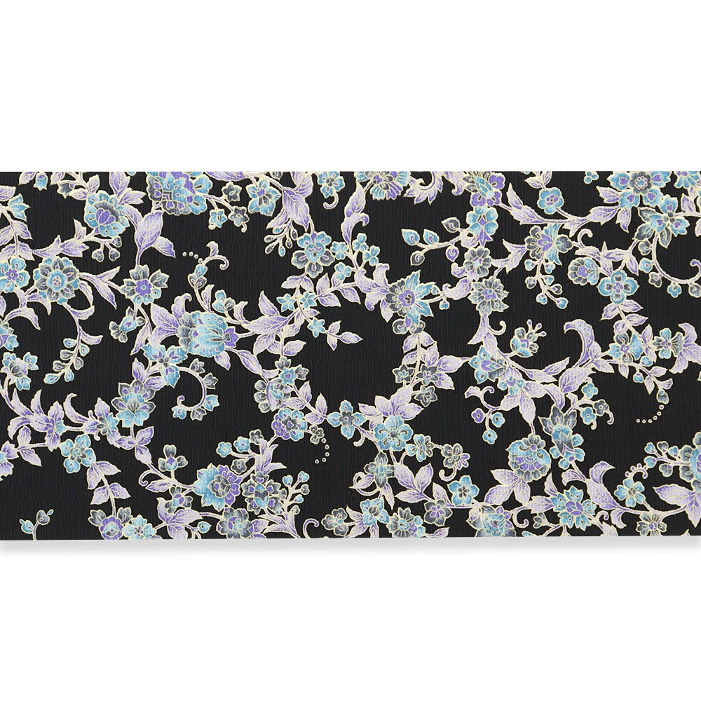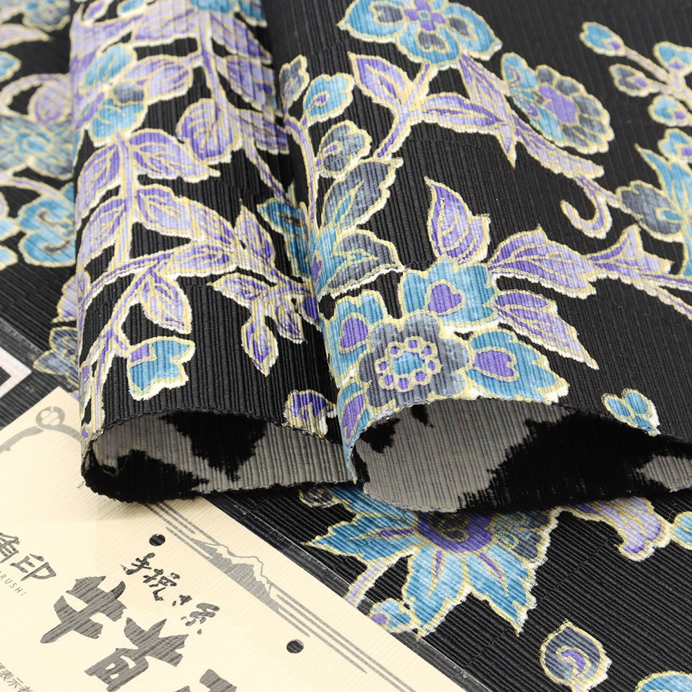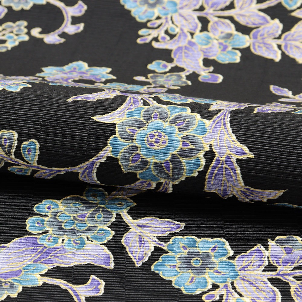 地織りの凹凸が特徴的な織地と、【岡重】の美麗な染め柄が融合した重厚感のある仕上がりに。縁のゴールドが繊細な柄行きを沈ませず、華やかに引き立てます。