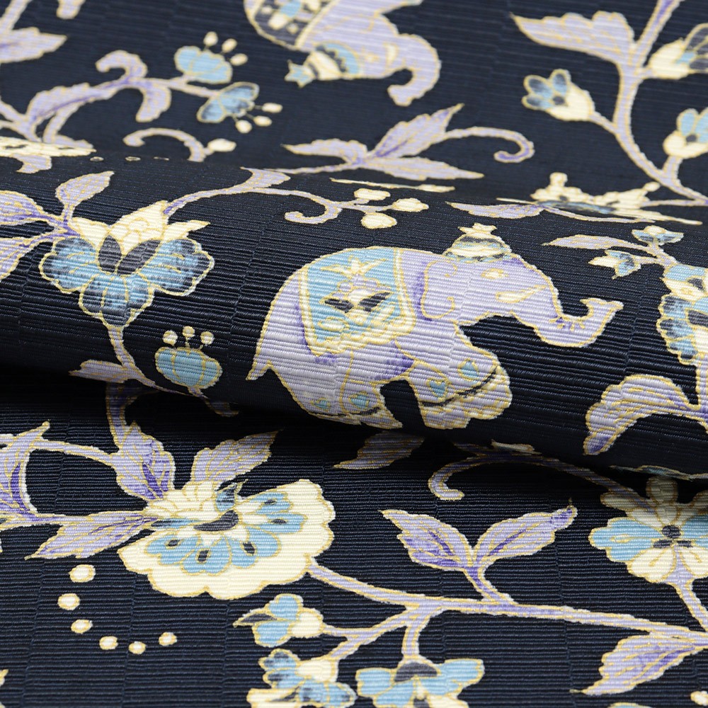 石川県「牛首紬・織の資料館」としても有名な【白山工房】の生地に、象更紗を染めあげたひと品。