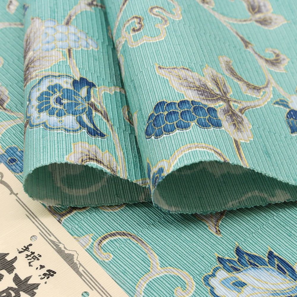 地織りの凹凸が特徴的な織地と、【岡重】の美麗な染め柄が融合した重厚感のある仕上がりに。縁のゴールドが繊細な柄行きを沈ませず、華やかに引き立てます。