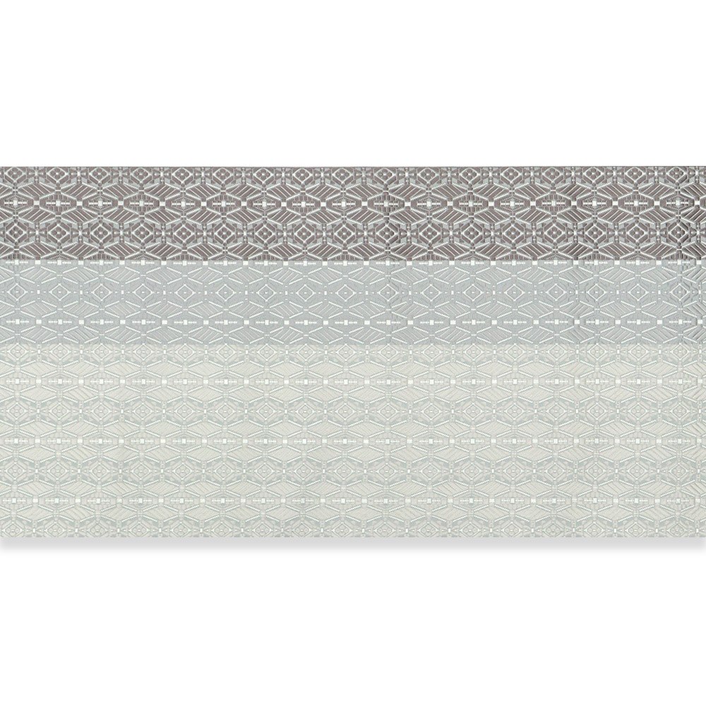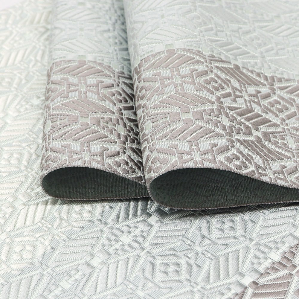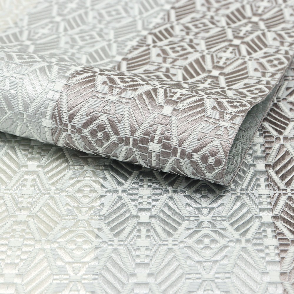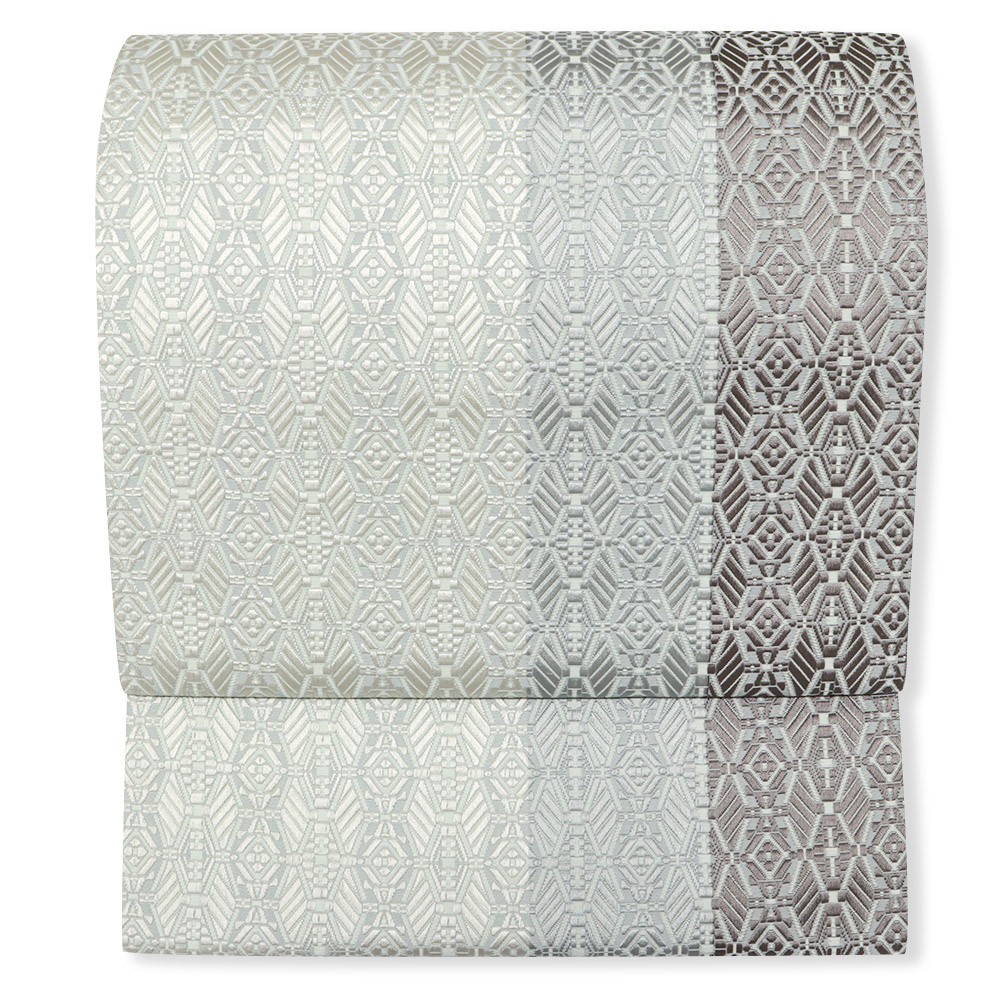 アイボリー、水色、灰の縦三色地に菱文が整然と並ぶ意匠は、淡いトーンながら重厚さを感じさせる仕上がりに。