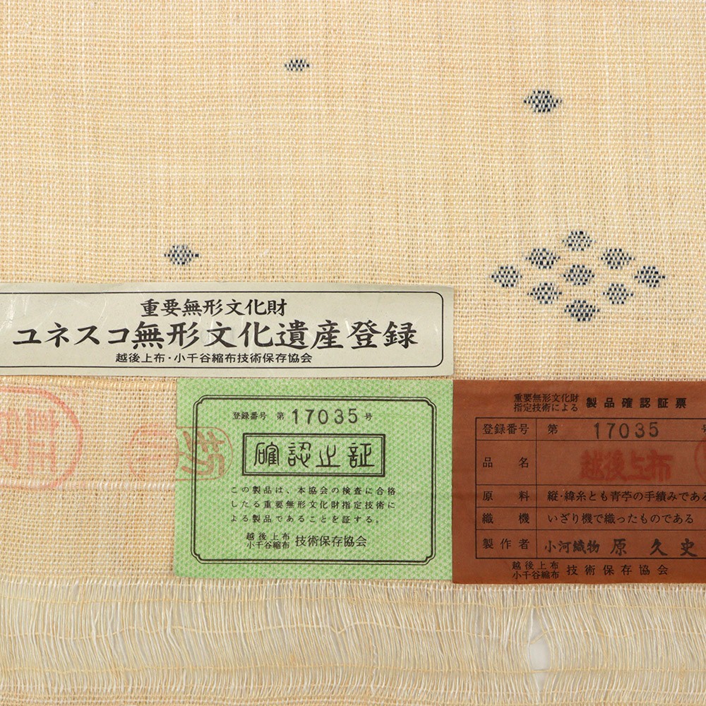 越後上布・小千谷縮布技術保存協会による確認証付き、【小河織物】謹製の八寸名古屋帯。