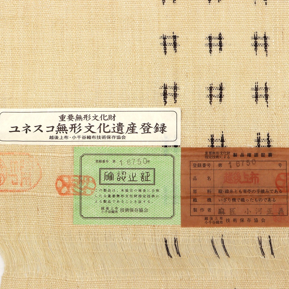 越後上布・小千谷縮布技術保存協会による確認証付き、【小河織物】謹製の八寸名古屋帯。