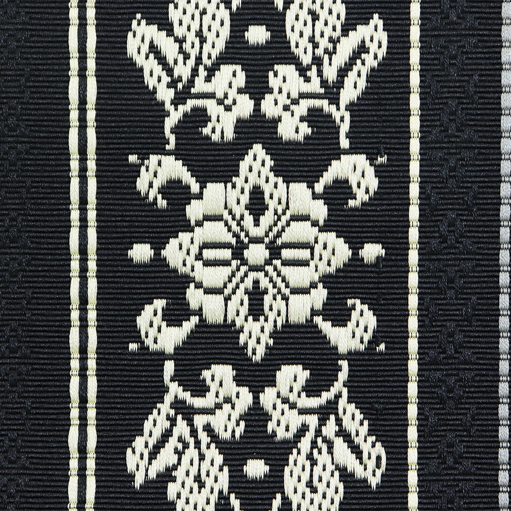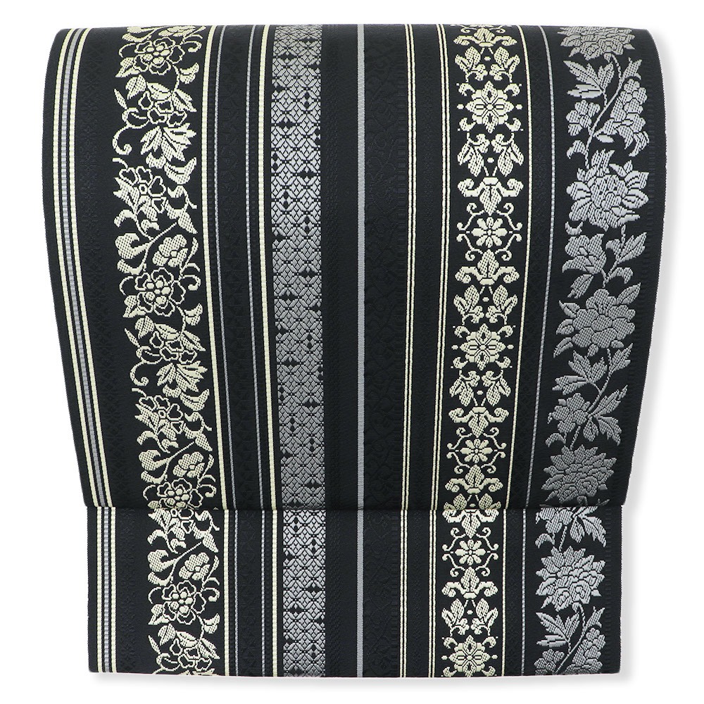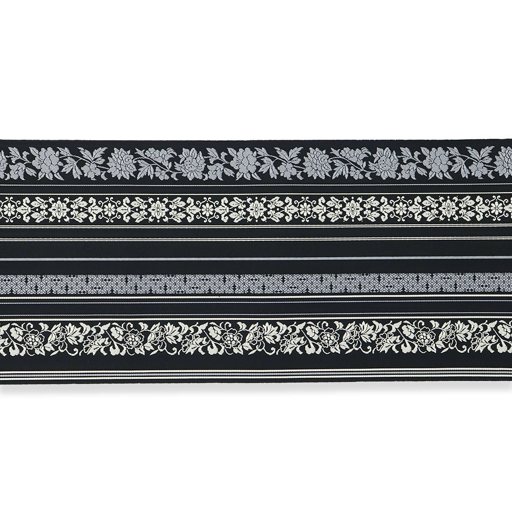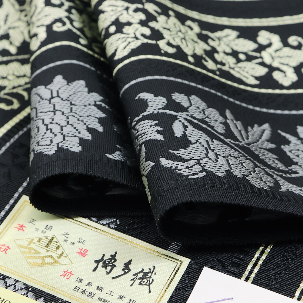 黒色の帯地に、薄黄色とグレーの更紗模様の間道が織り上げられた、落ち着きのある現代的な柄行きに仕上がっています。