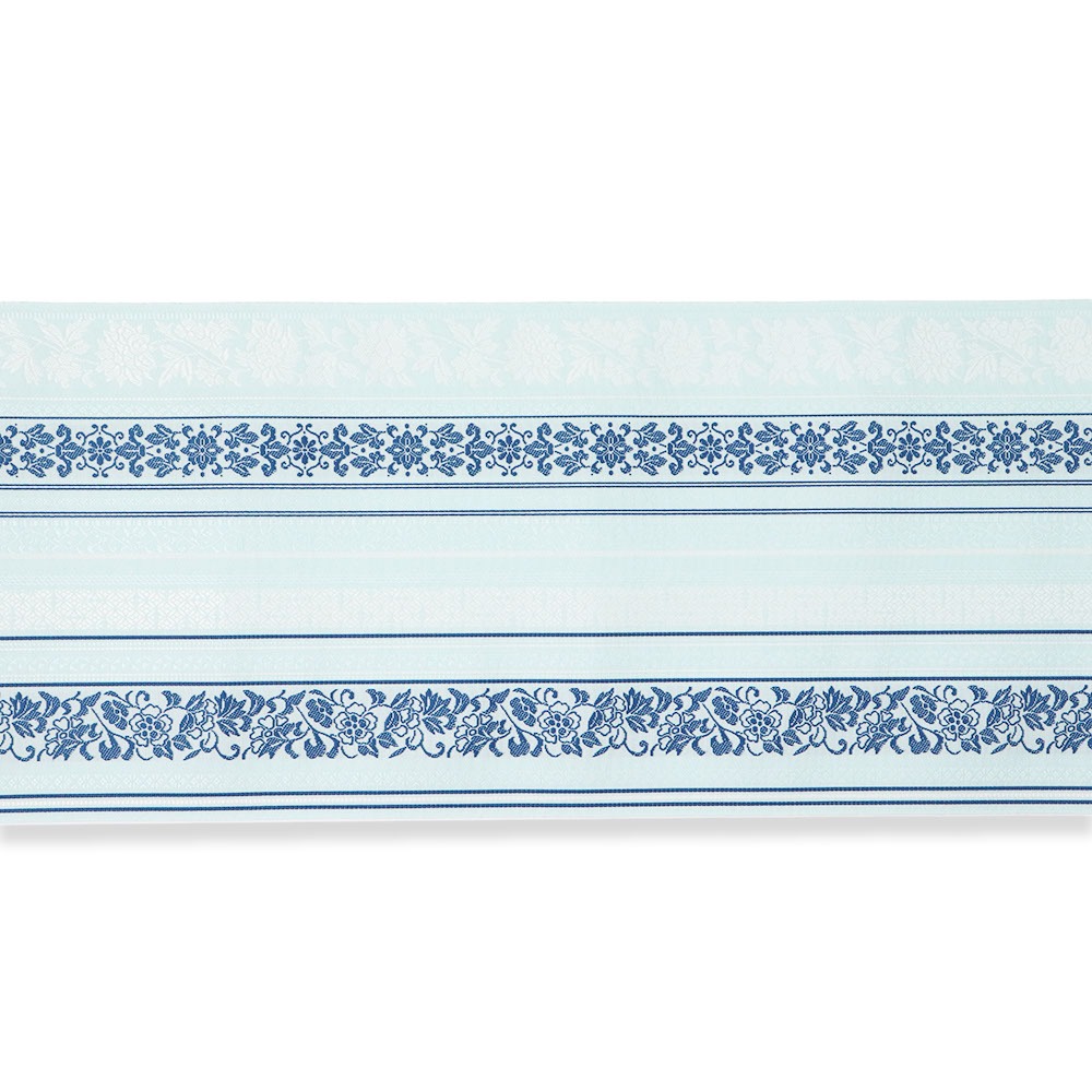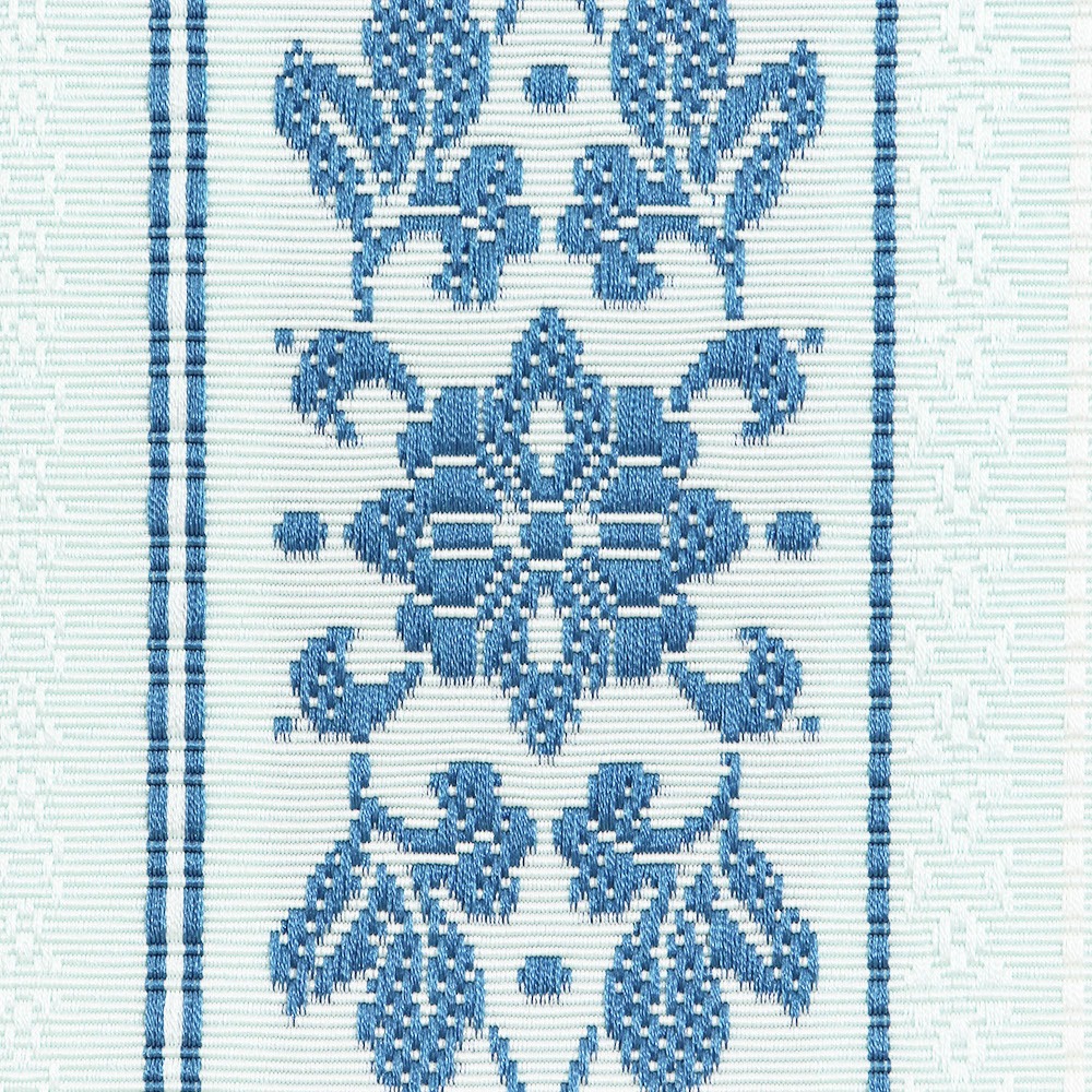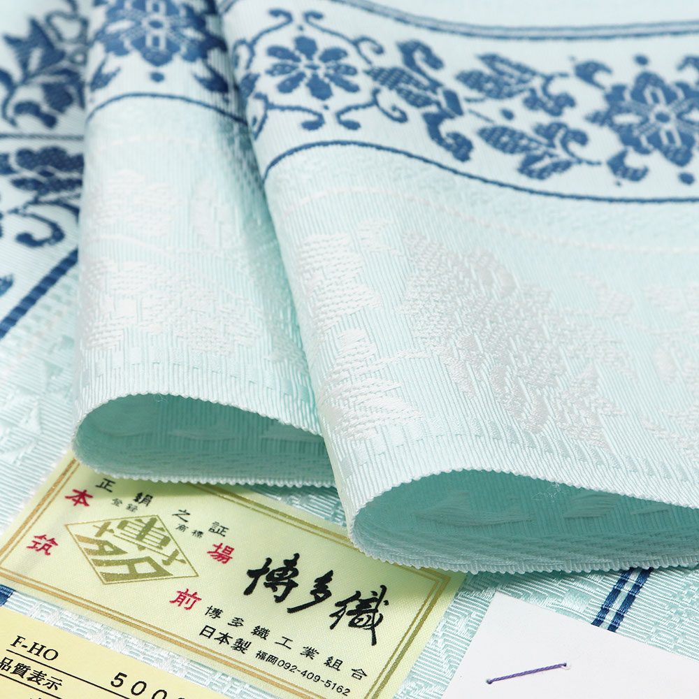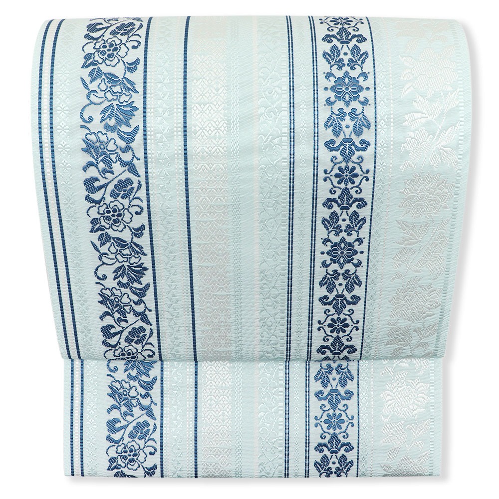 薄水色の帯地に、青と白の更紗模様の間道が織り上げられた、上品さと可愛さを兼ね備えた現代的な柄行きに仕上がっています。