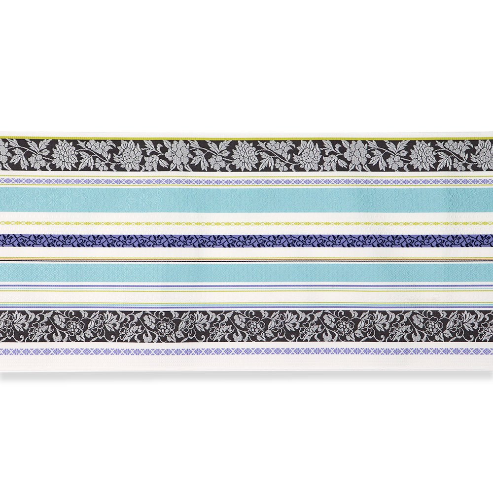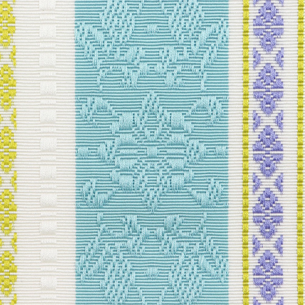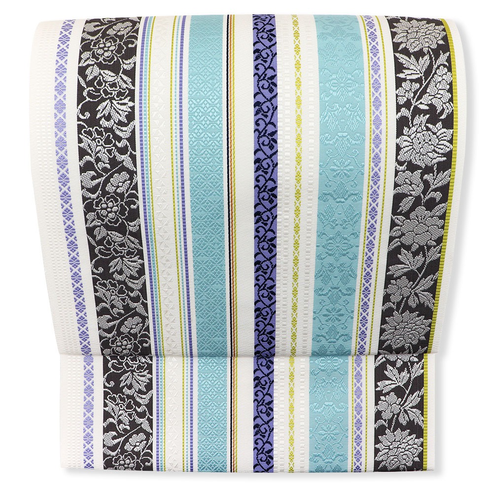白色の帯地に、水色や黒の更紗模様の間道が織り上げられた、メリハリのある現代的な柄行きに仕上がっています。
