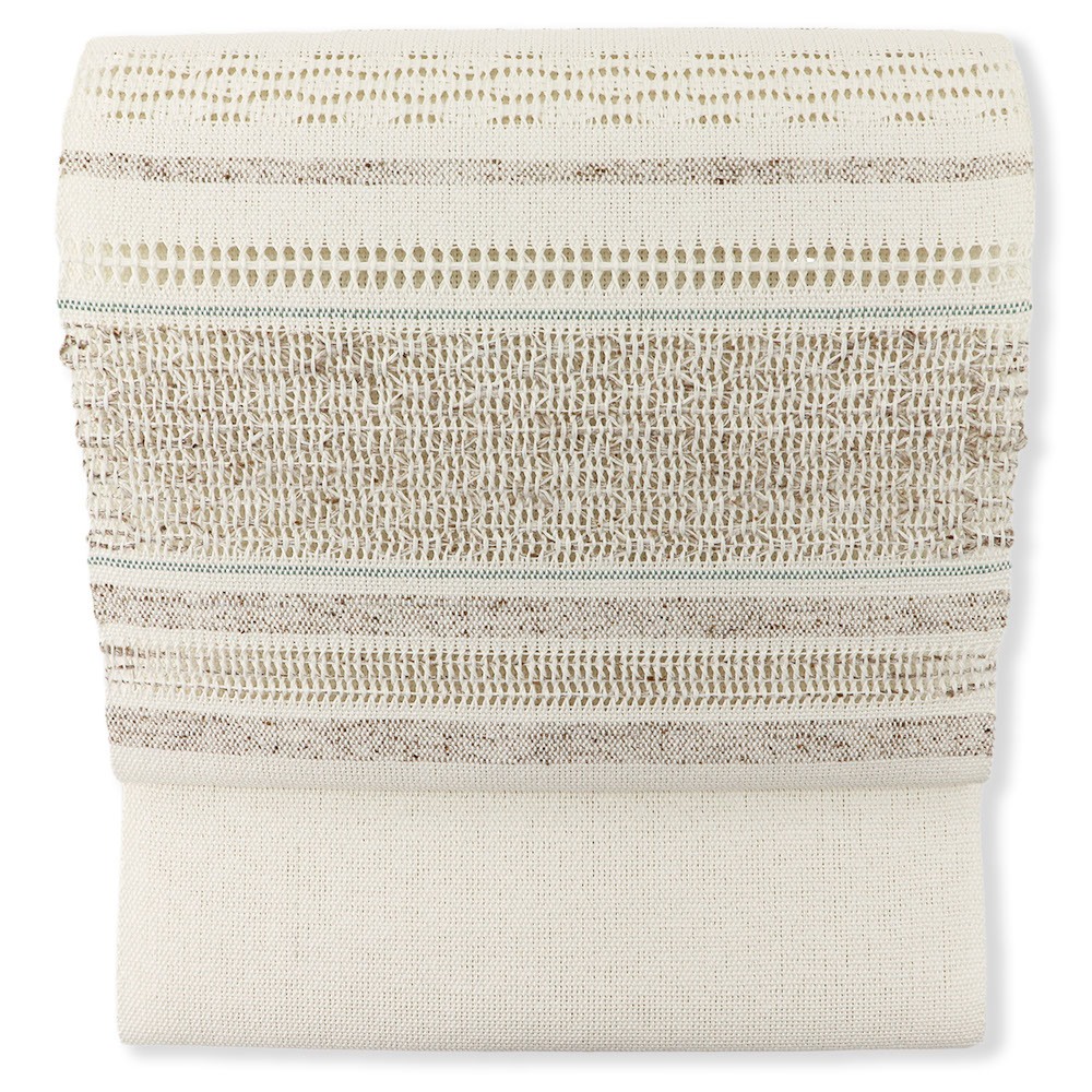 山形・庄内で受け継がれてきた技術が織りなす古代布を使用しています。ぜんまい真綿糸を使用した和紙糸で、お太鼓と腹前に軽やかな横段模様を表現。古代布ならではのざっくりとした手触りとナチュラルな色合いが、夏の帯元を自然な美しさへ導きます。
