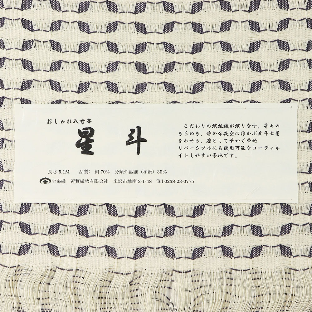 夜空に浮かぶ北斗七星をイメージして織られたこちらは、表は星のような菱模様、裏は横段模様が織り出されています。