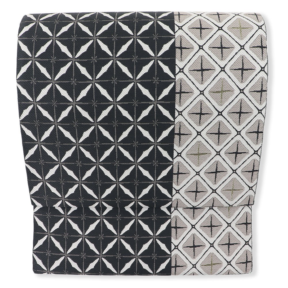 左右非対称なデザインですので手先を変えると二通りの腹前がお楽しみいただけます。印象的な柄行きですが落ち着いた色合いのため、着物の色を問わずに締められます。小紋や御召、紬などに合わせてお出かけをお楽しみください。