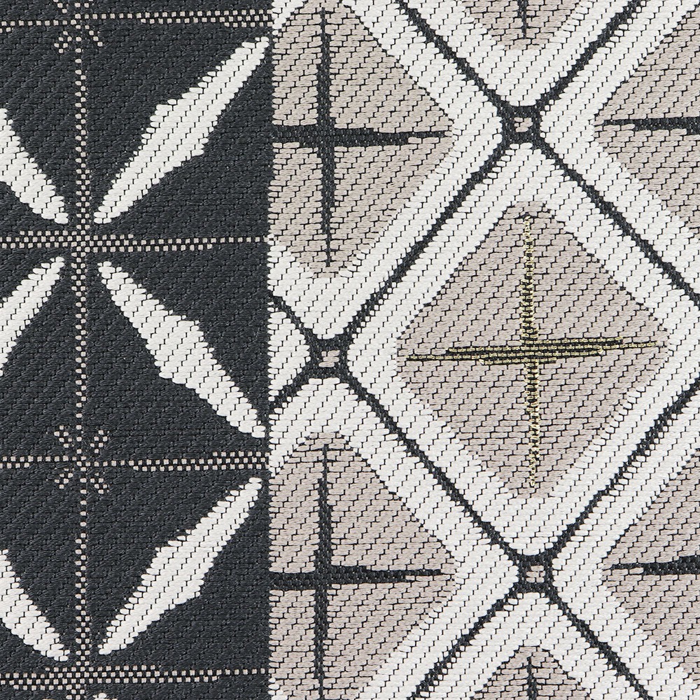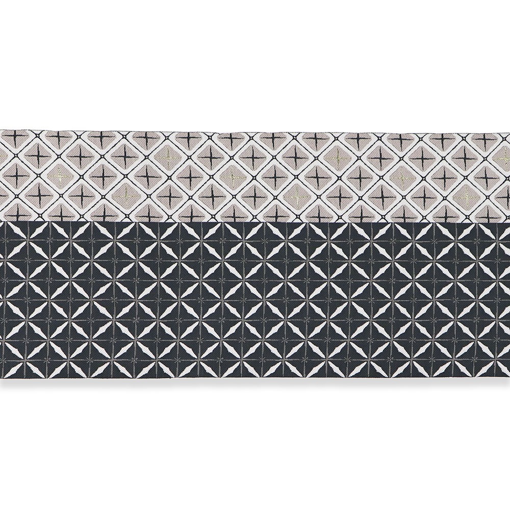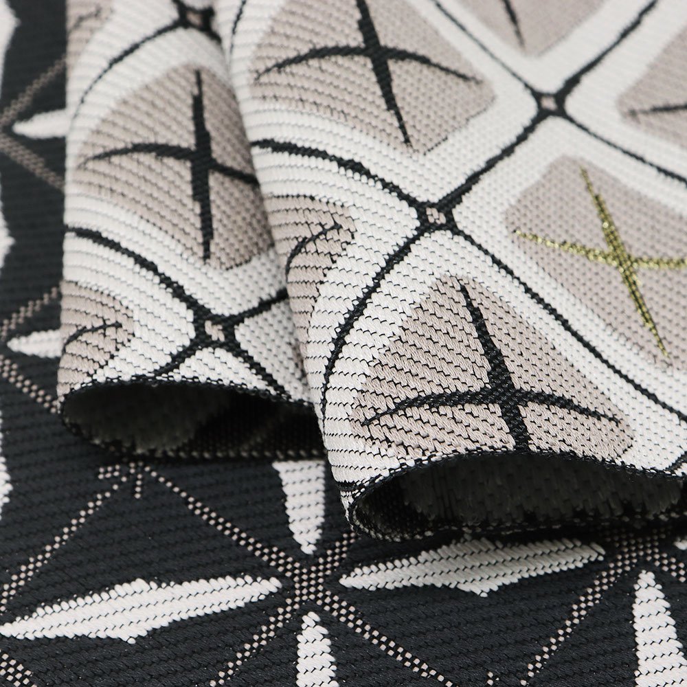 黒の変わり華紋詰を並べた名古屋帯です。薄灰色の華紋詰には金糸のアクセントをつけて上品に。