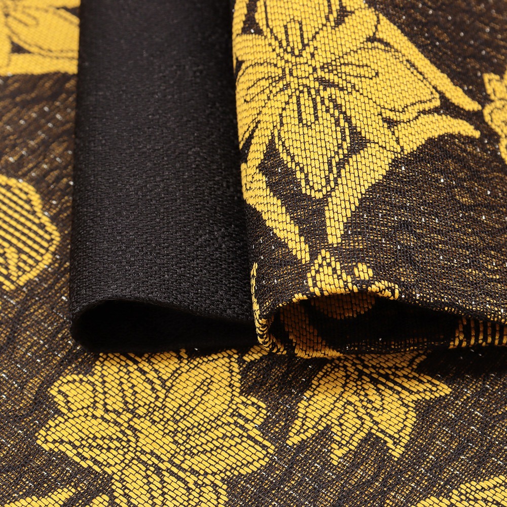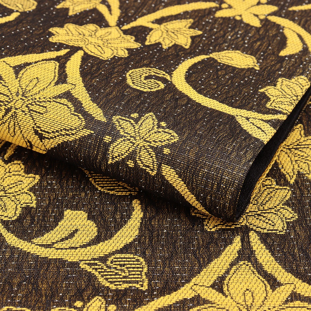 イエロー×ブラウンの配色でアラベスク模様を織りあげた一本。