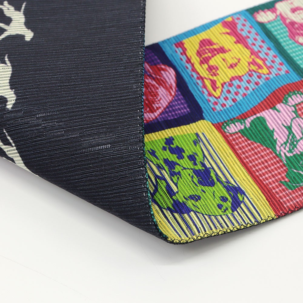 その日の気分やコーデによって裏表を選べるリバーシブル仕様も、召しませ花シリーズのポイント。アンディ・ウォーホル風のワンちゃんが並ぶ面と、ワンちゃんが走っている様子をコマ送りで表現した面、犬好きの心を刺激するモダンなポップデザインをお楽しみください。