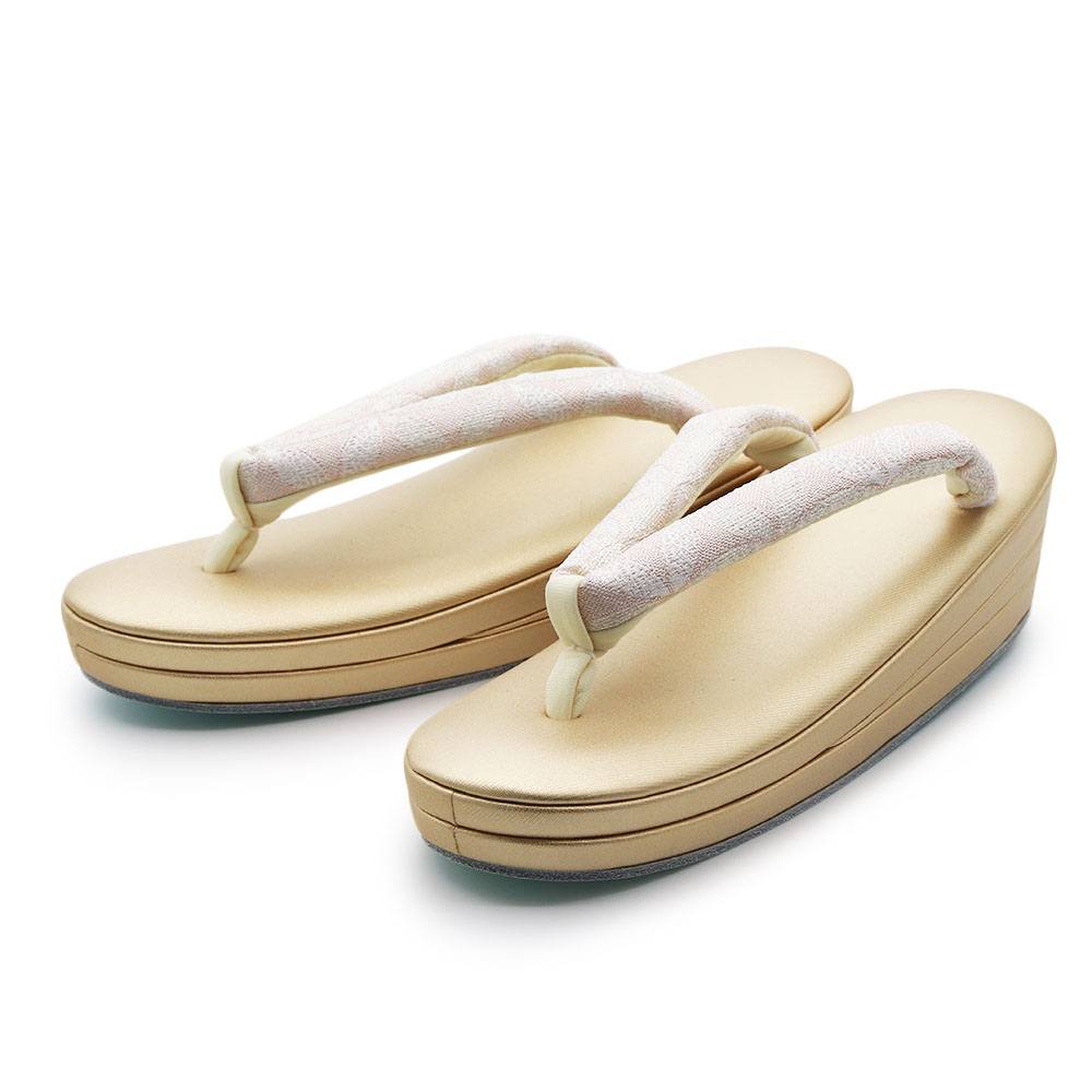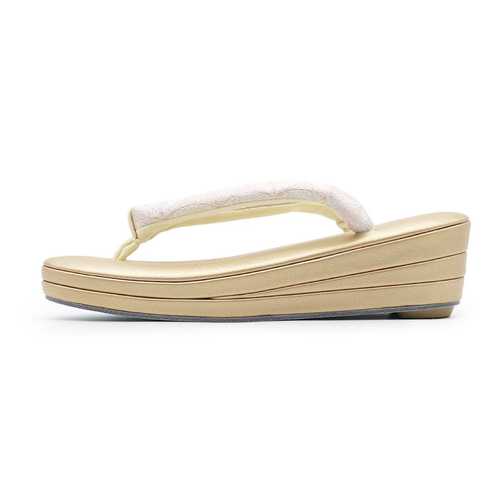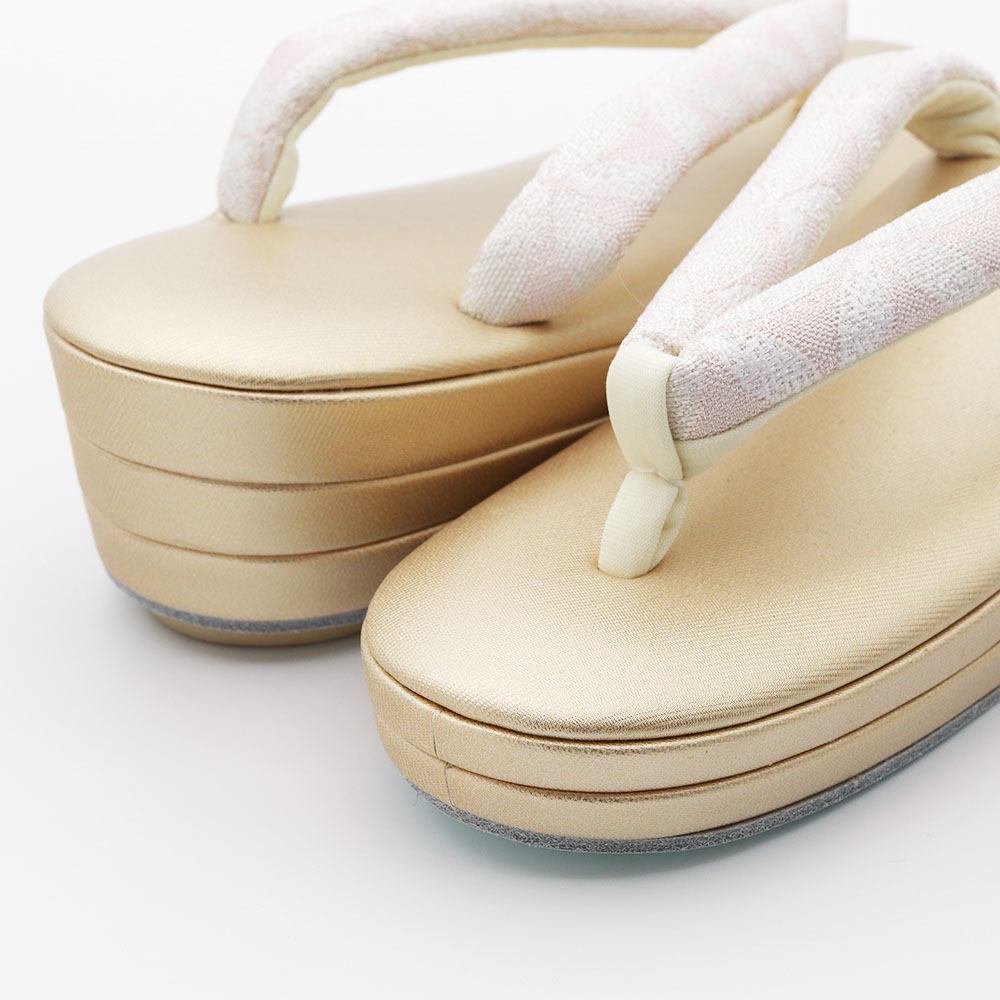 かかとは三枚芯、つま先が二枚芯になった「二の三枚芯」草履。クリームとゴールドを混ぜたような控えめな艶感の台に、箔糸を交えた華やかな鼻緒で、訪問着などの装いにも履いていただける、セミフォーマルにピッタリの一足です。脱いだときの所作や揃えて置いたときの佇まいなどにこだわり、和装ならではの極上の気品と雅が漂うデザインに。かかとにはゴムを使用しているので、しっかり歩けて滑りにくいのも嬉しいポイントです。