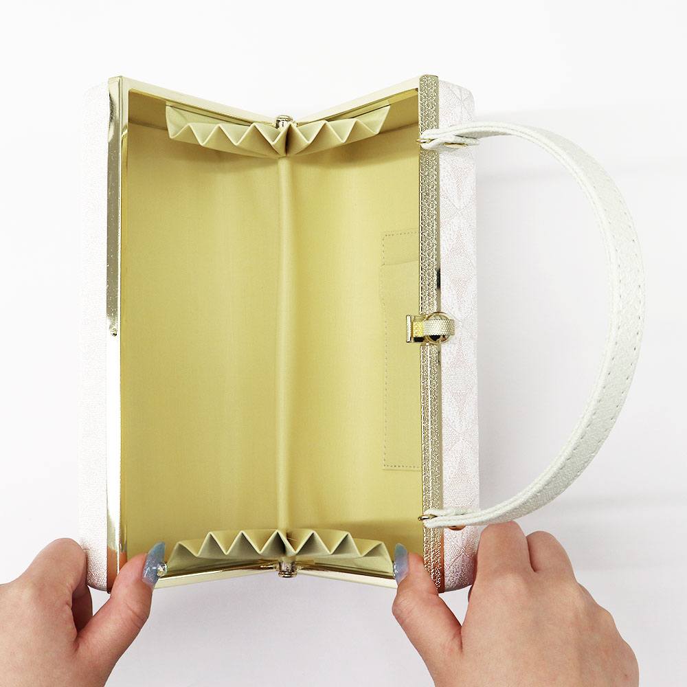 現代女性が使いやすいよう熟考を重ねたバッグは、着物によく合い、美しく手元に収まる上品な小ぶりサイズ。それでいて、大きく開くがま口にマチ幅が広い大容量なデザインで、お出かけ前に持っていく物を選別する必要がなくなりそうです。バッグの中には小さなポケットが付いており、小物が散らばる心配もありません。また、口金にはゴールドを採用し、丸く造形された小さなツマミはテコの原理で力を入れずとも簡単に開く嬉しい機能性。バッグを開く動作も自然とスマートに決まります。