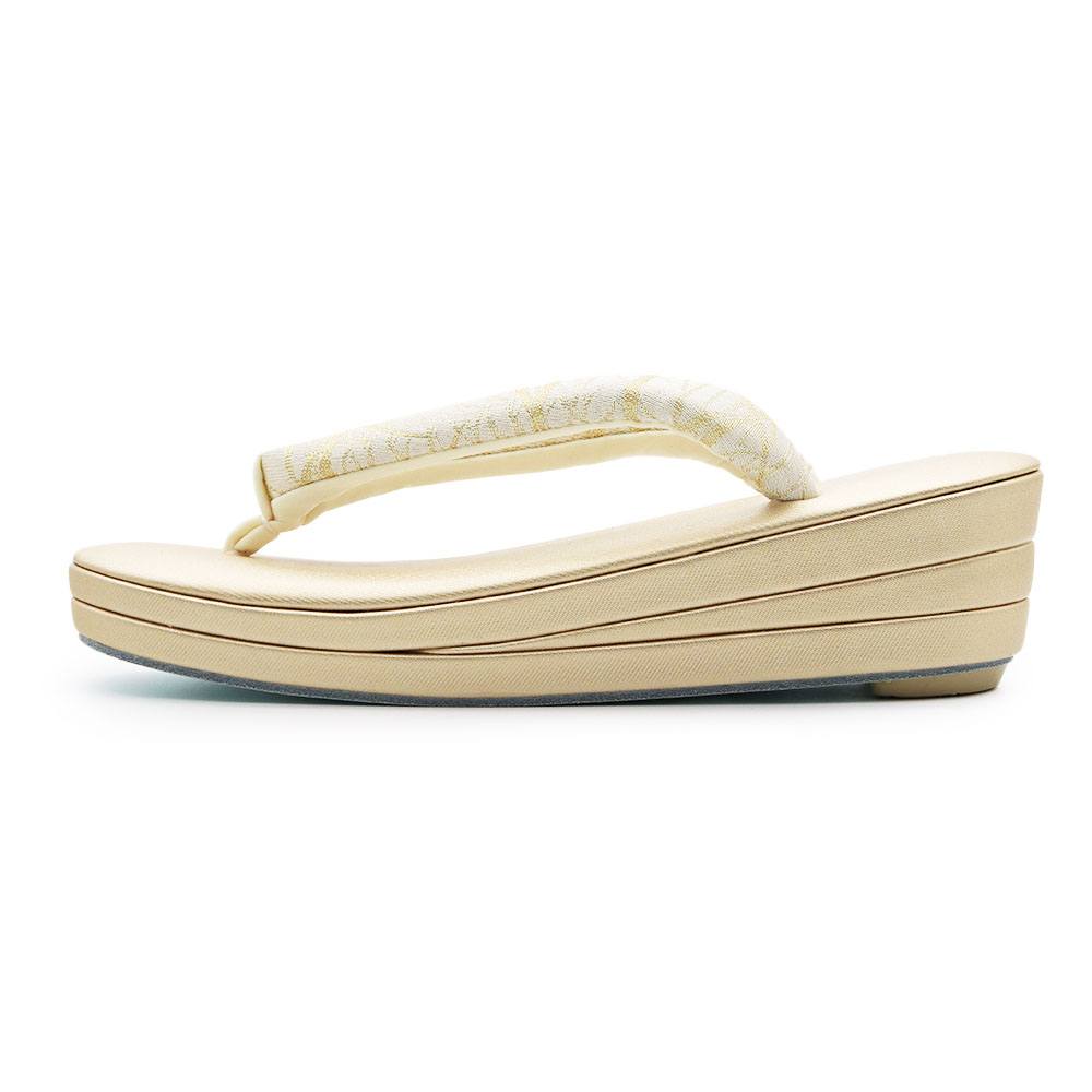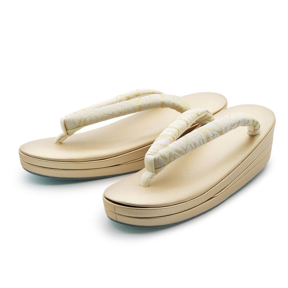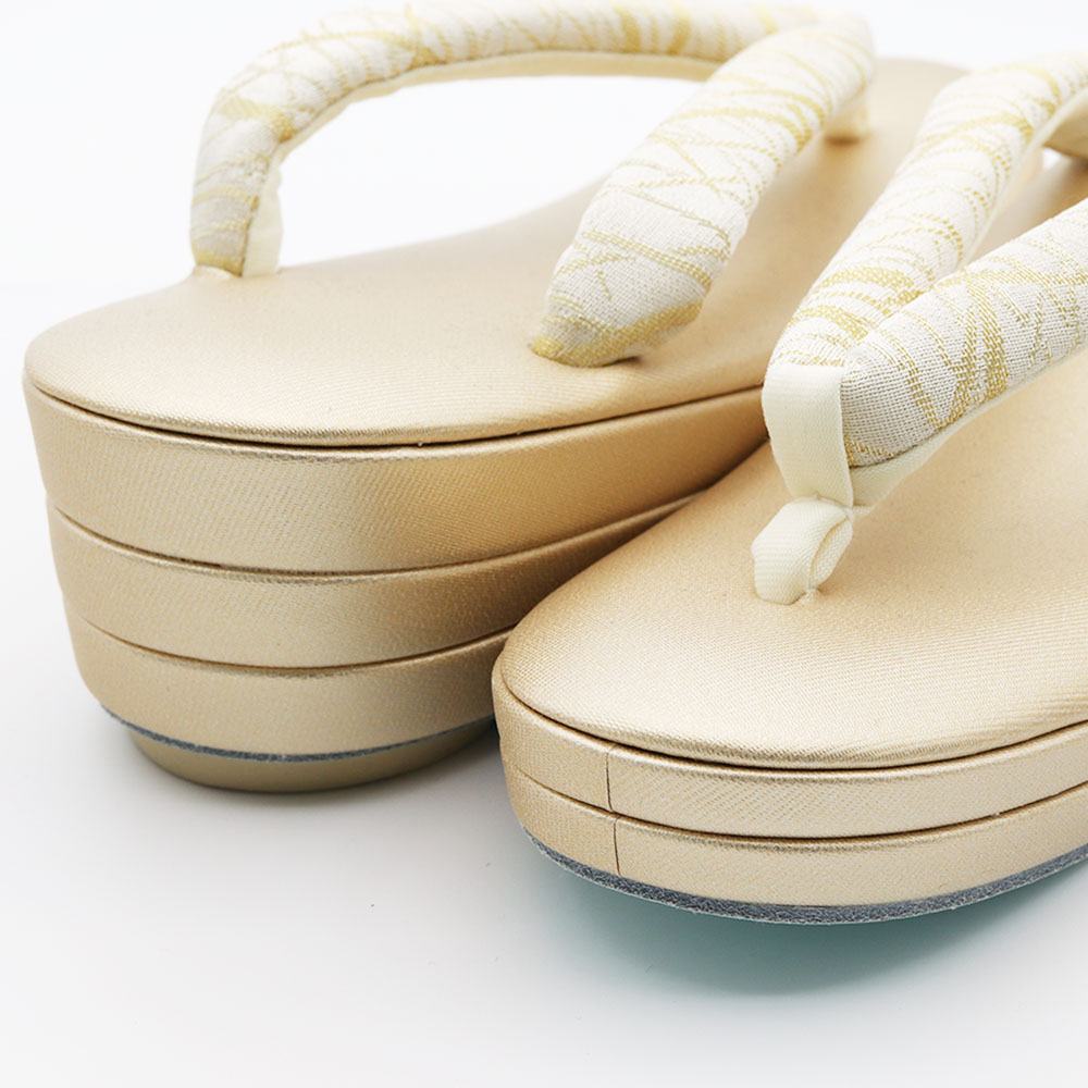 かかとは三枚芯、つま先が二枚芯になった「二の三枚芯」草履。クリームとゴールドを混ぜたような控えめな艶感の台に、箔糸を交えた華やかな鼻緒で、訪問着などの装いにも履いていただける、セミフォーマルにピッタリの一足です。脱いだときの所作や揃えて置いたときの佇まいなどにこだわり、和装ならではの極上の気品と雅が漂うデザインに。かかとにはゴムを使用しているので、しっかり歩けて滑りにくいのも嬉しいポイントです。