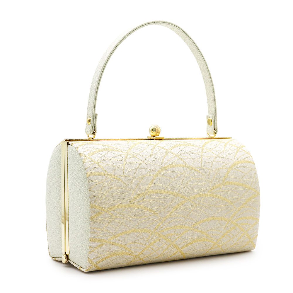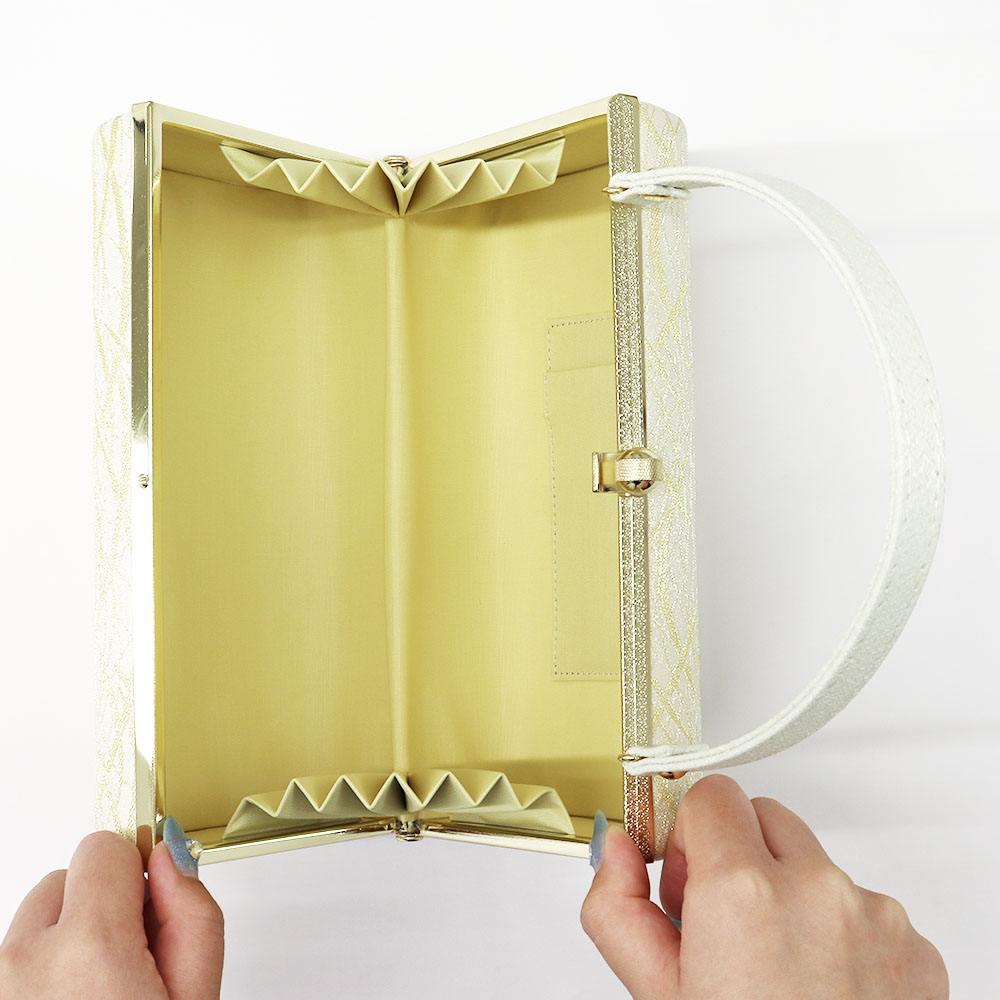 現代女性が使いやすいよう熟考を重ねたバッグは、着物によく合い、美しく手元に収まる上品な小ぶりサイズ。それでいて、大きく開くがま口にマチ幅が広い大容量なデザインで、お出かけ前に持っていく物を選別する必要がなくなりそうです。バッグの中には小さなポケットが付いており、小物が散らばる心配もありません。また、口金にはゴールドを採用し、丸く造形された小さなツマミはテコの原理で力を入れずとも簡単に開く嬉しい機能性。バッグを開く動作も自然とスマートに決まります。
