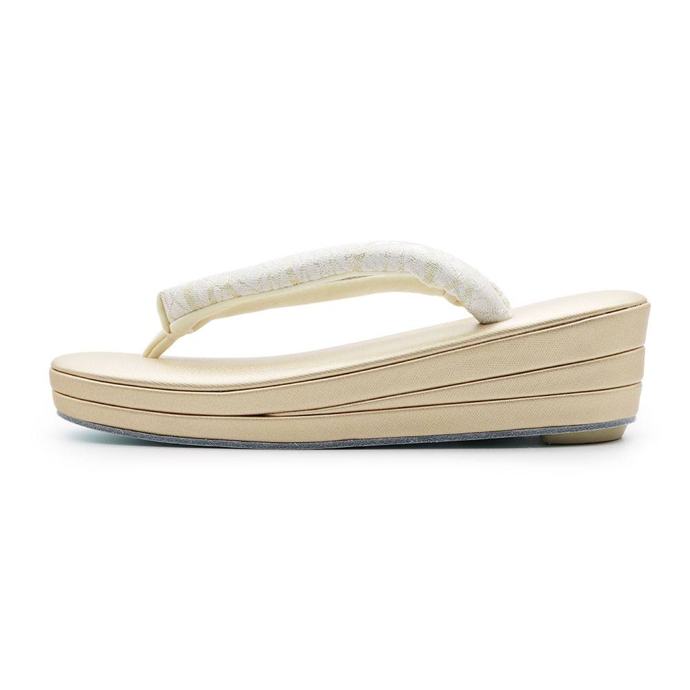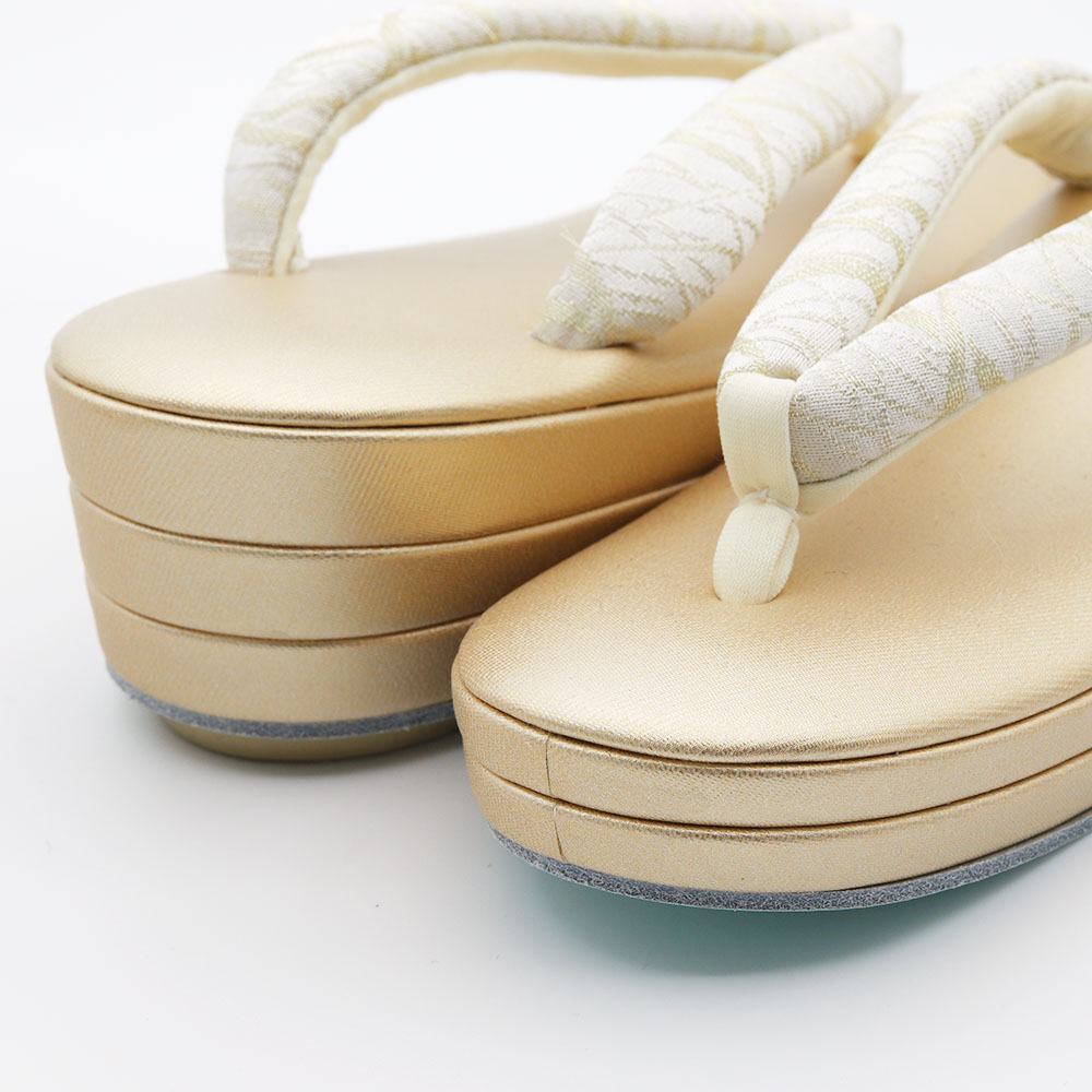 かかとは三枚芯、つま先が二枚芯になった「二の三枚芯」草履。クリームとゴールドを混ぜたような控えめな艶感の台に、箔糸を交えた華やかな鼻緒で、訪問着などの装いにも履いていただける、セミフォーマルにピッタリの一足です。脱いだときの所作や揃えて置いたときの佇まいなどにこだわり、和装ならではの極上の気品と雅が漂うデザインに。かかとにはゴムを使用しているので、しっかり歩けて滑りにくいのも嬉しいポイントです。