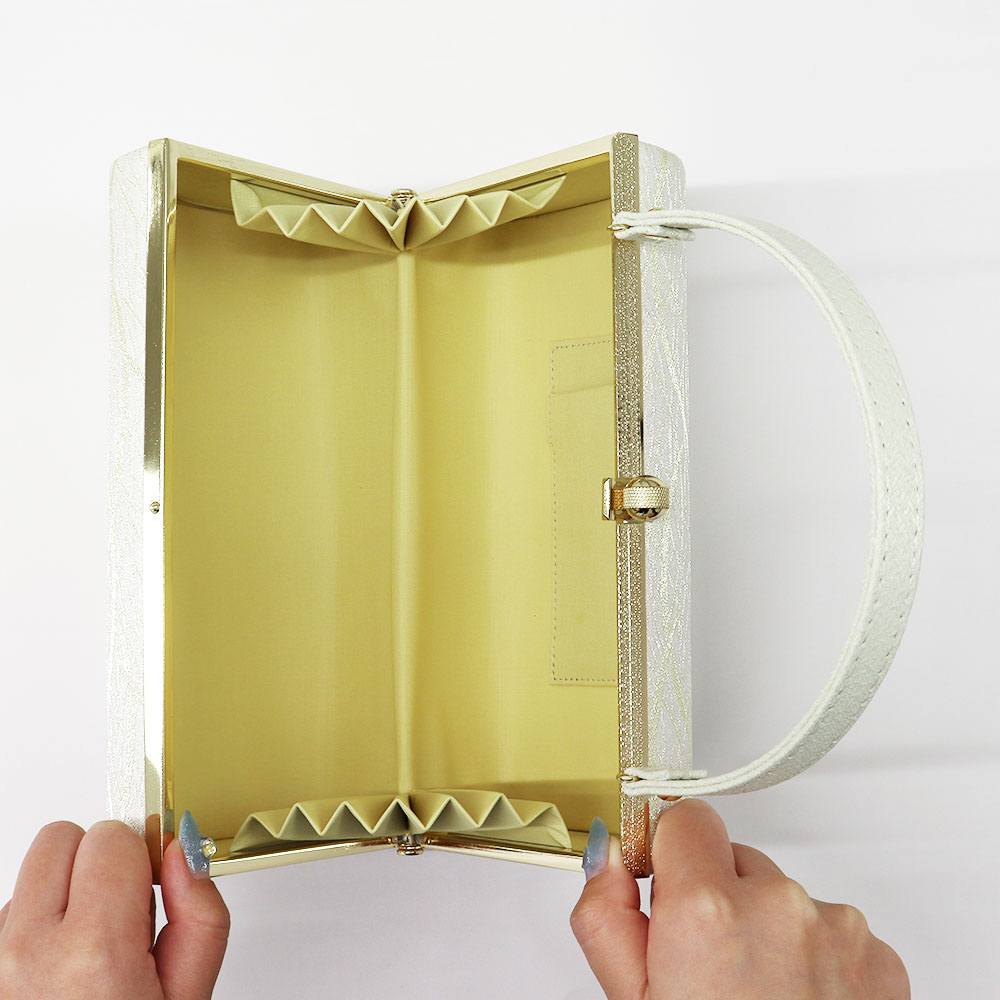 現代女性が使いやすいよう熟考を重ねたバッグは、着物によく合い、美しく手元に収まる上品な小ぶりサイズ。それでいて、大きく開くがま口にマチ幅が広い大容量なデザインで、お出かけ前に持っていく物を選別する必要がなくなりそうです。バッグの中には小さなポケットが付いており、小物が散らばる心配もありません。また、口金にはゴールドを採用し、丸く造形された小さなツマミはテコの原理で力を入れずとも簡単に開く嬉しい機能性。バッグを開く動作も自然とスマートに決まります。