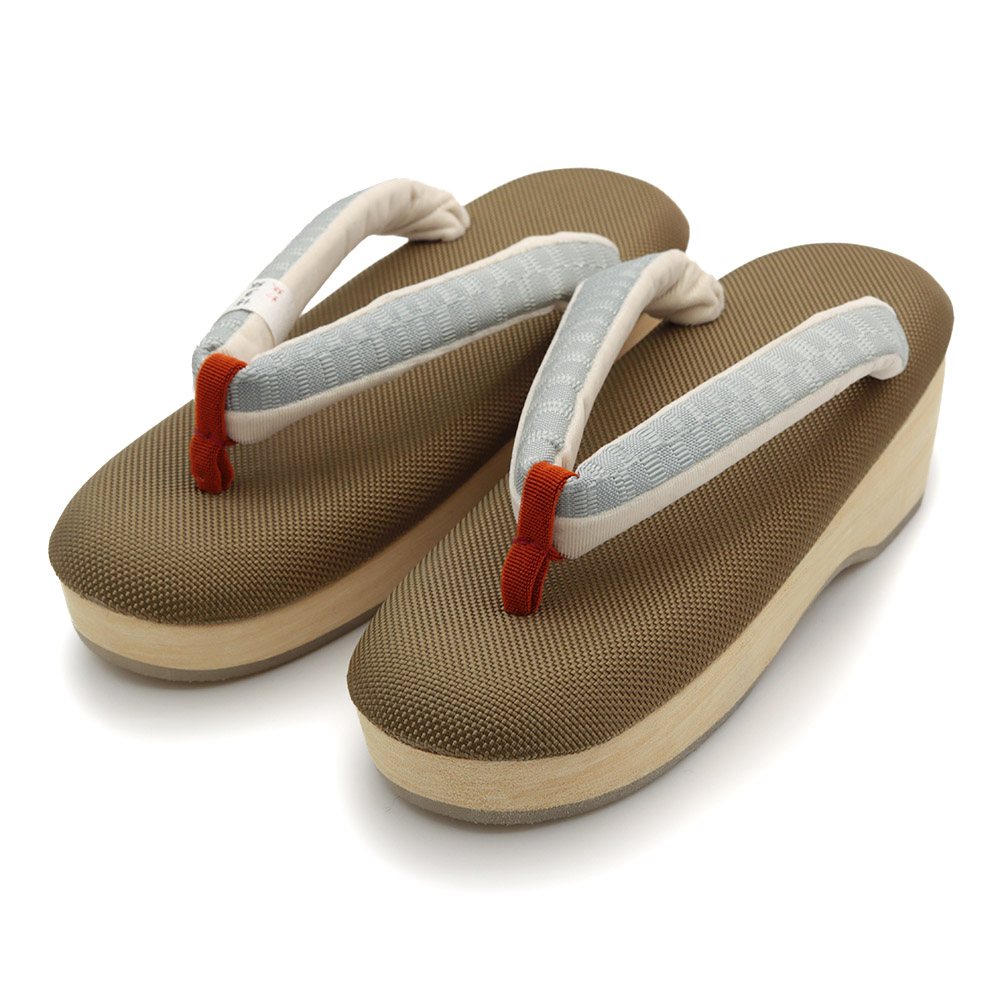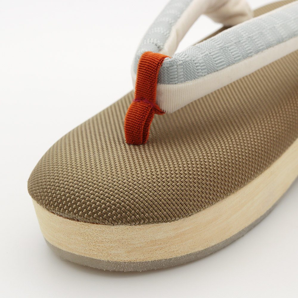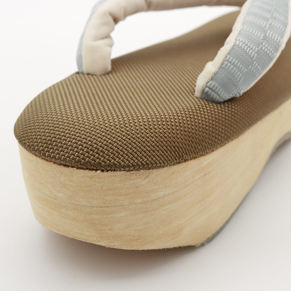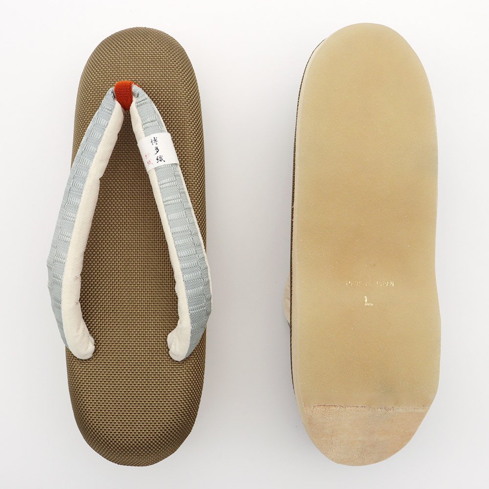 ポコポコとした凹凸の織り感が味わい深い草履天と、横段模様の博多織鼻緒を組み合わせたひと品。