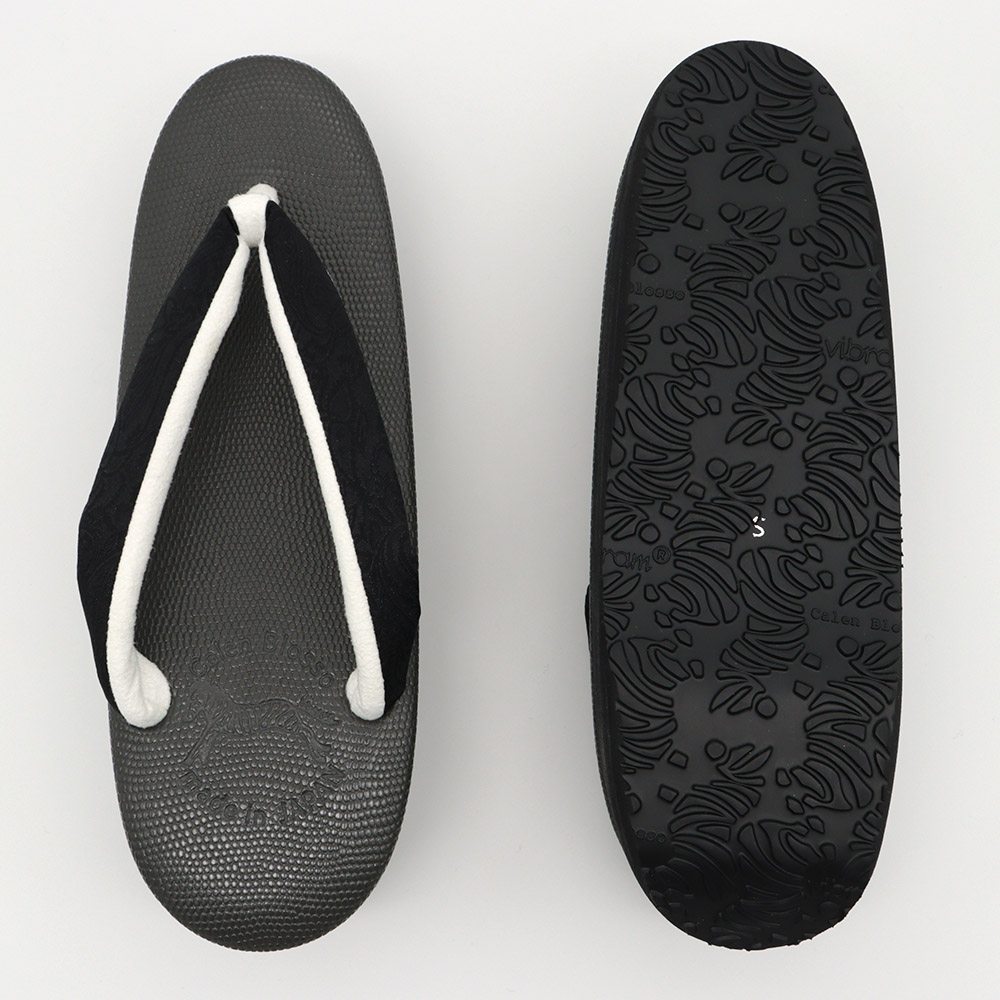 型押し牛革の草履天に、ペイズリー地紋の鼻緒を合わせたデザイン。シンプルな中にも洒落感がただよう、都会的な仕上がりです。