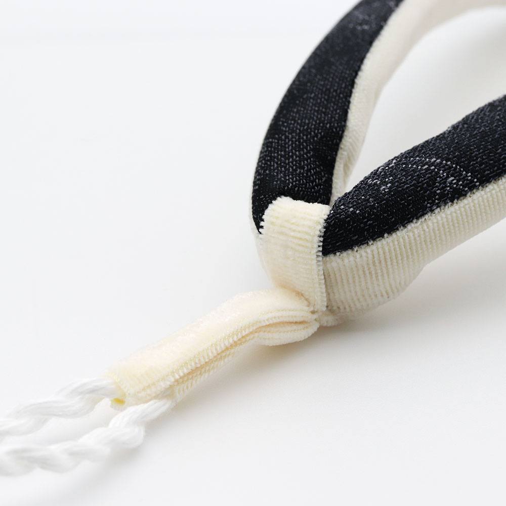 こちらの鼻緒は、着物や帯地を使用した絹100%で、デザイン性が高く重厚感のある仕上がりです。鼻緒裏は、足に当たっても痛くなりにくい柔らかな裏起毛。前坪も柔らかな素材を使用し、優しいクリーム色がどんな台にも合わせやすいですね。