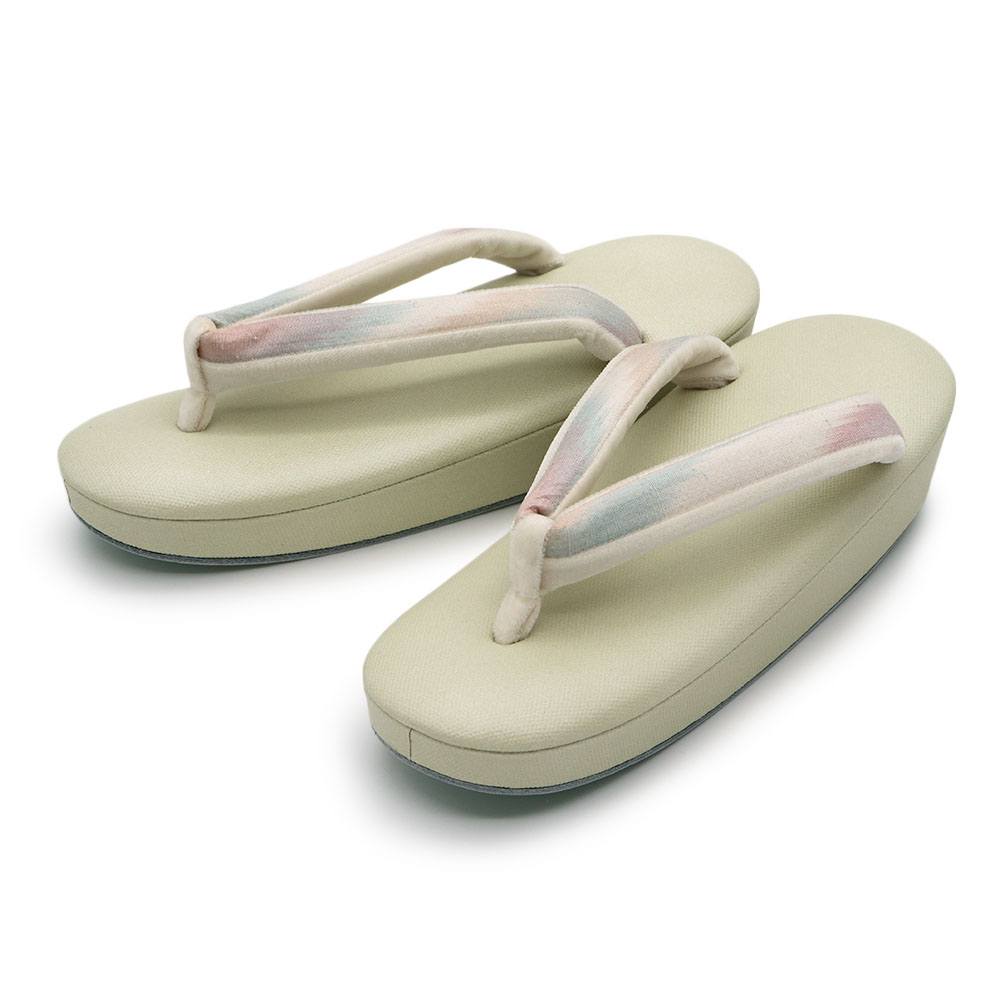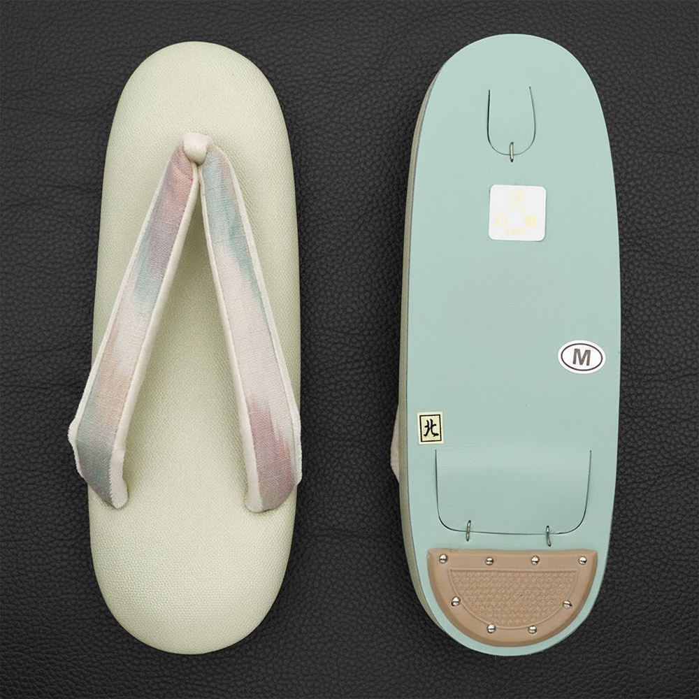 若芽色の台に、紬地の鼻緒を合わせた一足。最もシンプルな一枚芯に淡い色合いの組み合わせで、柔らかく軽やかな雰囲気になっています。