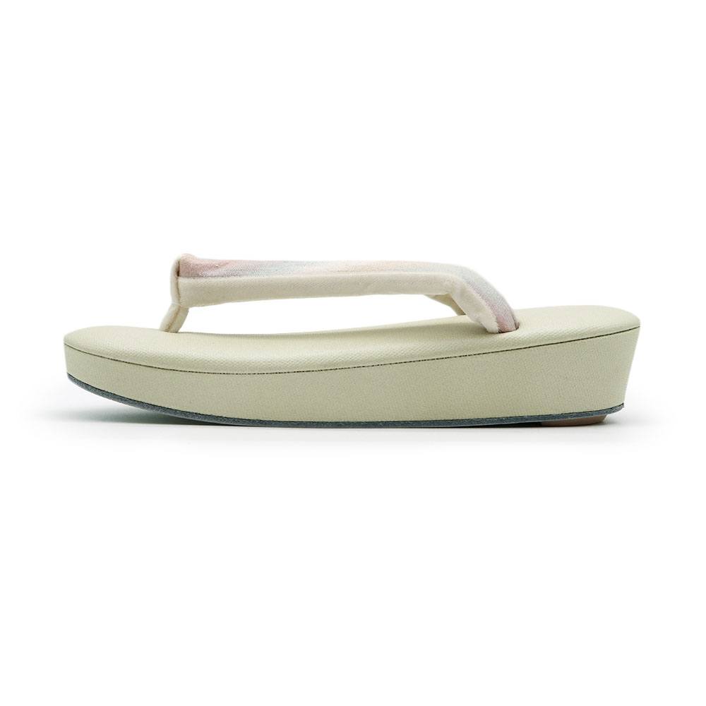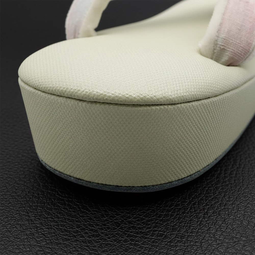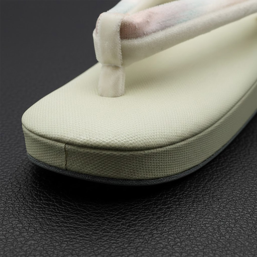 鼻緒裏や前坪はふわふわとした生地なので、足への接触面は柔らかに。すげ穴が付いているので鼻緒の調節が可能です(※専門店にご相談ください)。かかとゴムも交換可能なので、どんどん歩いて長く楽しめるのも嬉しいですね。