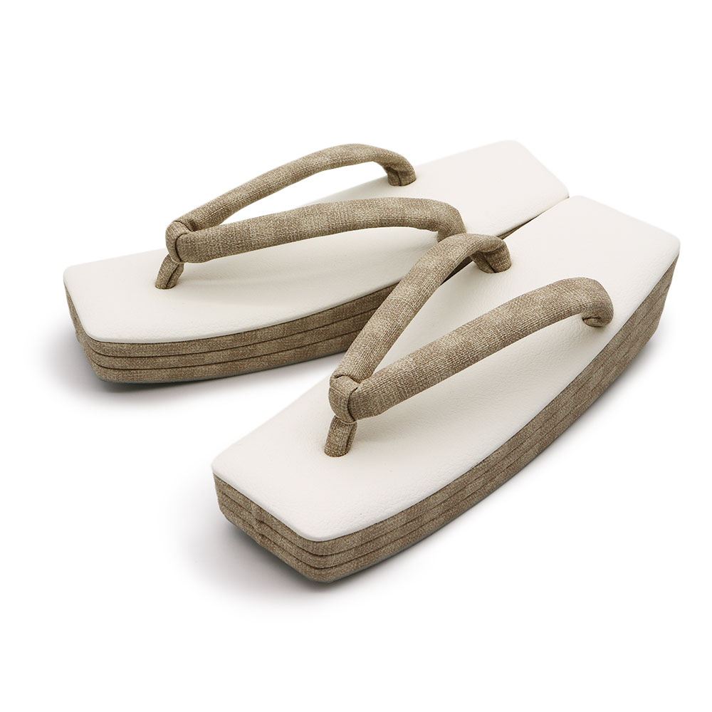 ホワイトの合皮の台と、市松柄のグレージュの側面を組み合わせた一足。鼻緒には側面と同様のグレージュ地を配したデザインです。