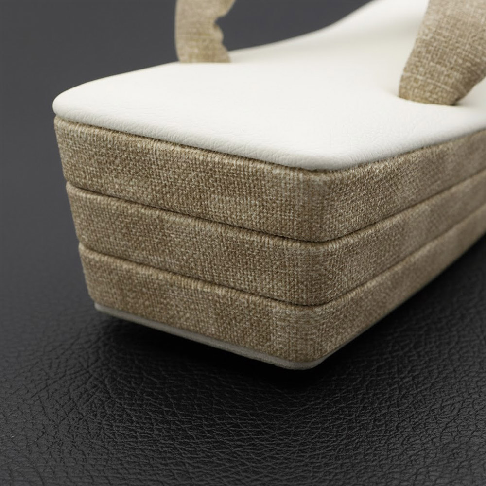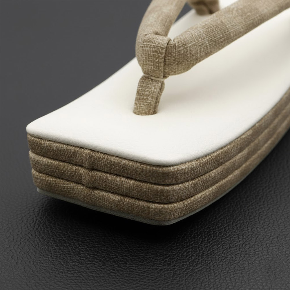 つま先からかかとにかけて紡錘形のように細くなっていくスクエア型は、履いたときにもすっきりとしたスマートな印象に。三枚芯なのでカジュアルになりすぎず、コーディネートに使いやすい草履になっています。