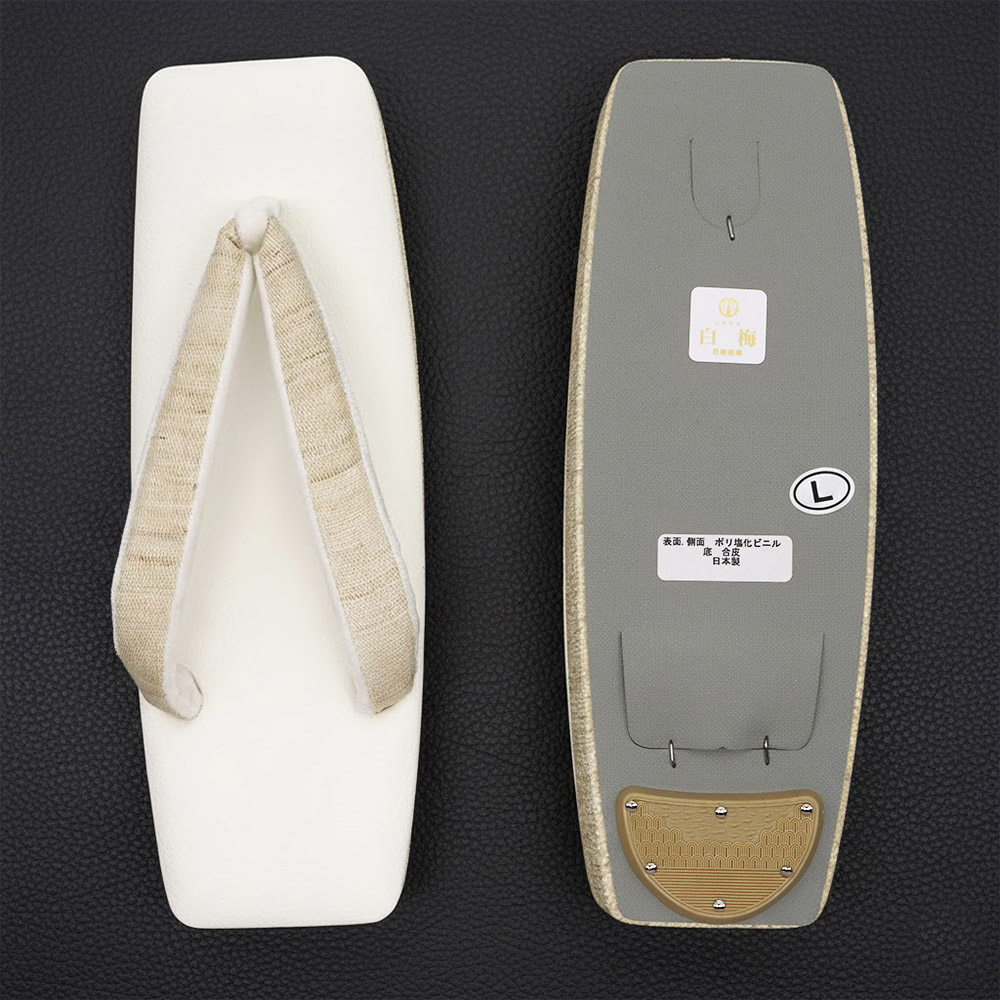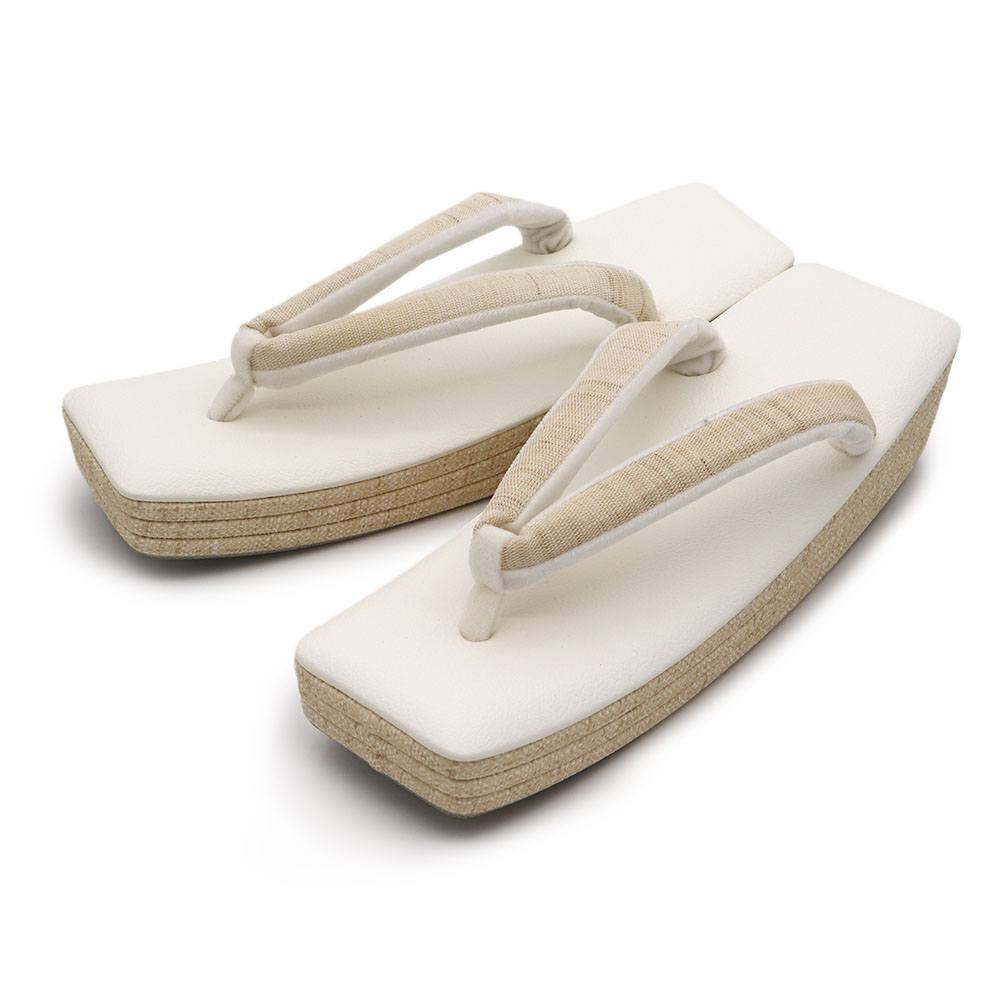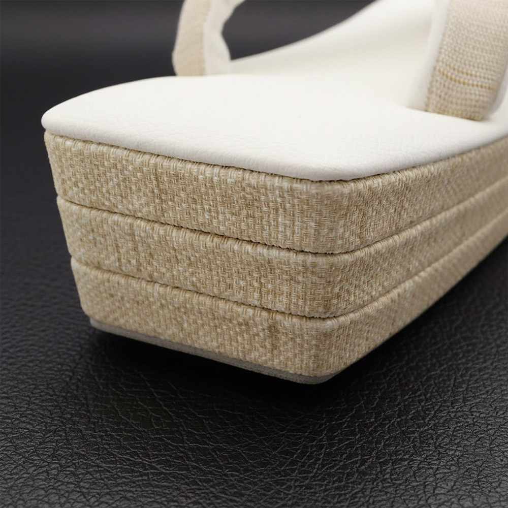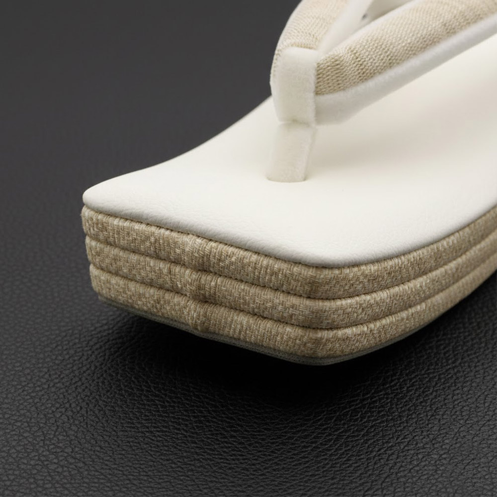 ホワイトの合皮の台と、ライトベージュの側面を組み合わせた一足。鼻緒には紬のような織地を配したデザインです。