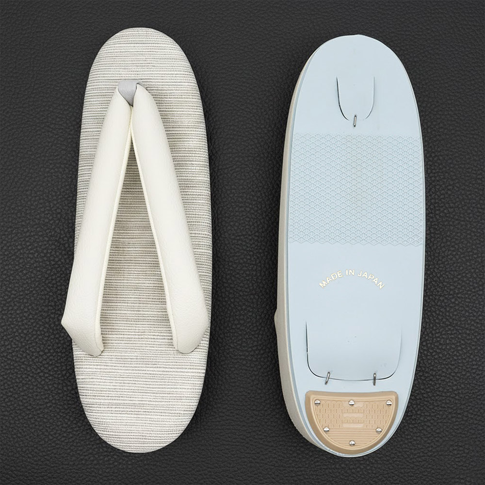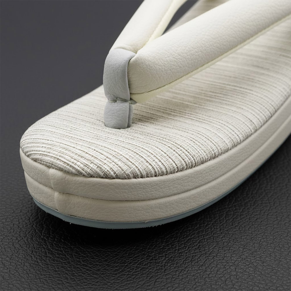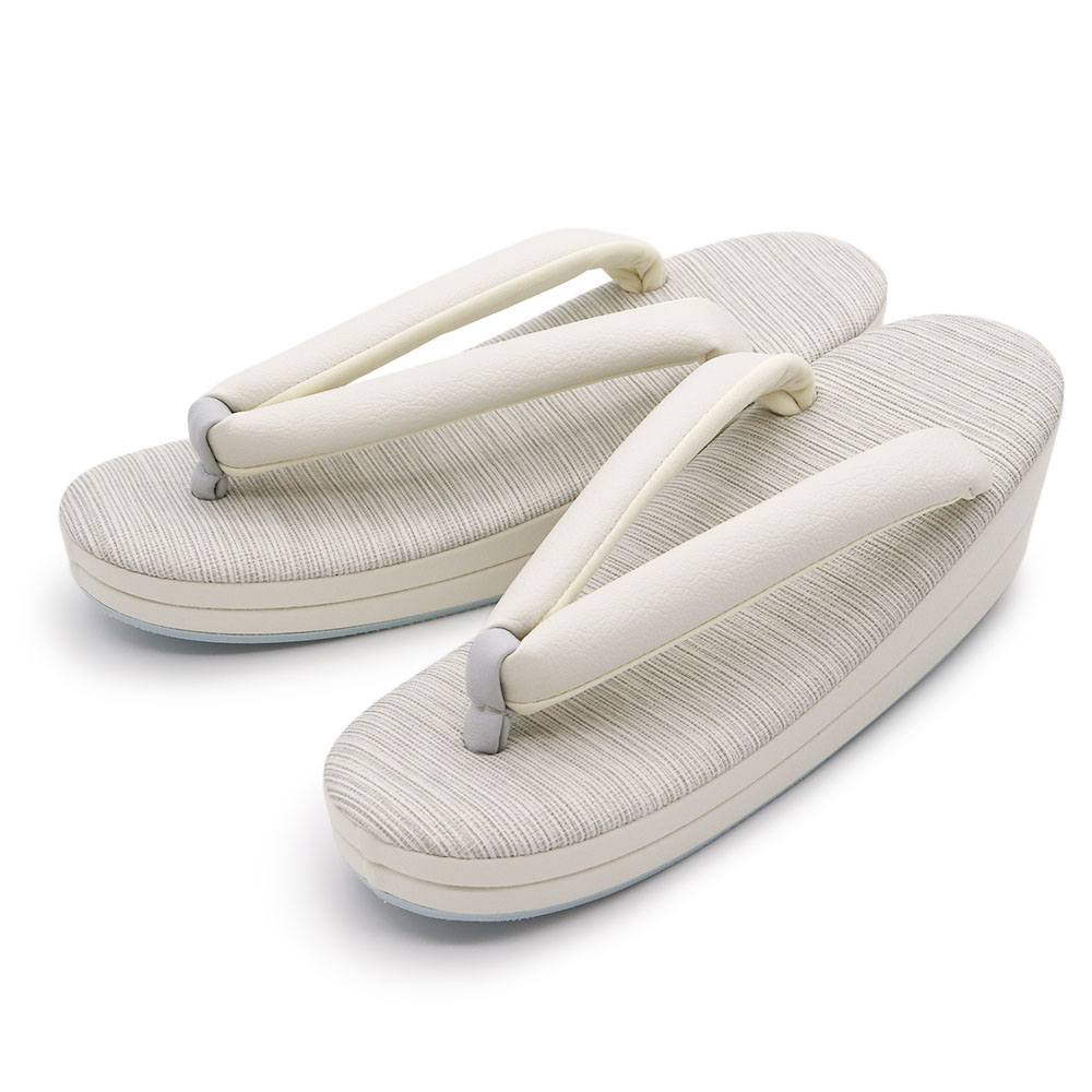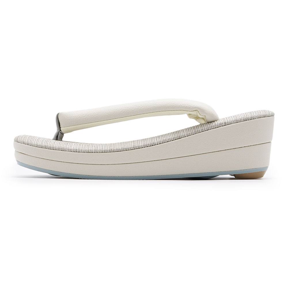 織地のような模様を型押ししたライトグレーの台と、シンプルな無地の鼻緒を配した一足。草履を履いたときにはつま先や側面から台の模様が見え隠れし、脱いだ時にはオシャレな柄行きが楽しめるデザインになっています。二枚芯は華やかすぎず、けれどしっかりと高さがほしい方にオススメです。