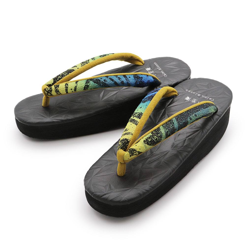 ダイアモンドカットと呼ばれる【カレンブロッソ】の草履台と、【小室庵】の染め生地鼻緒を合わせた一足。