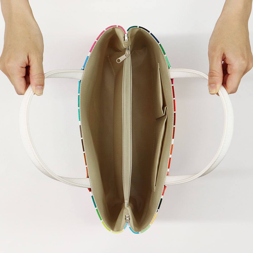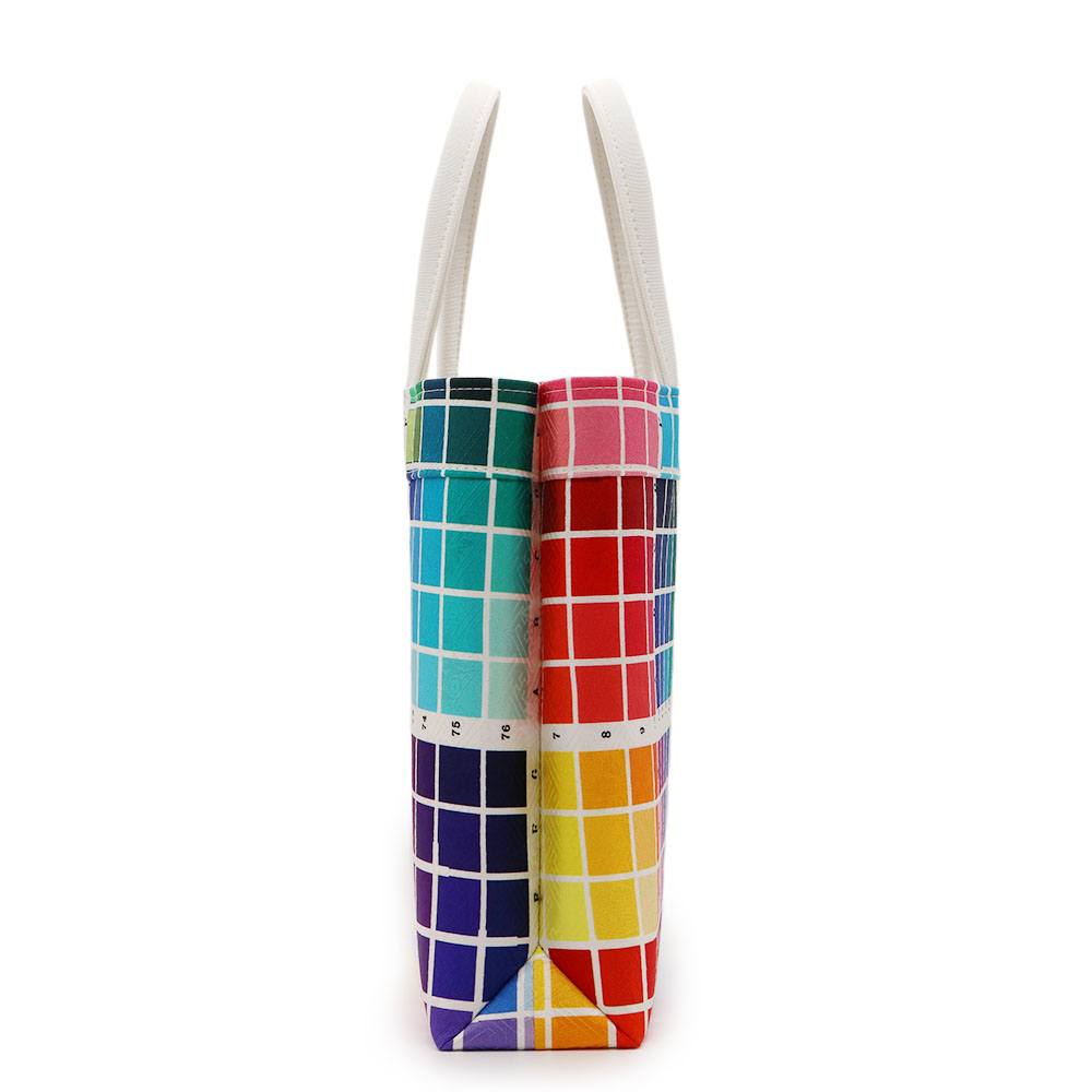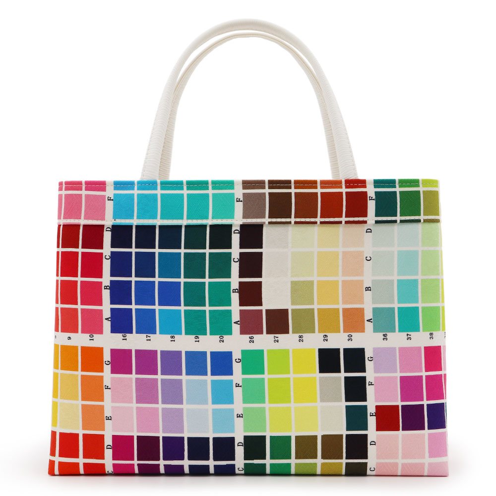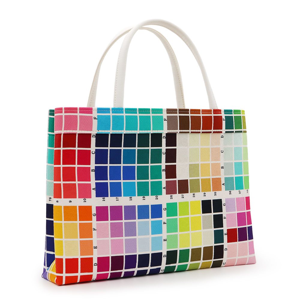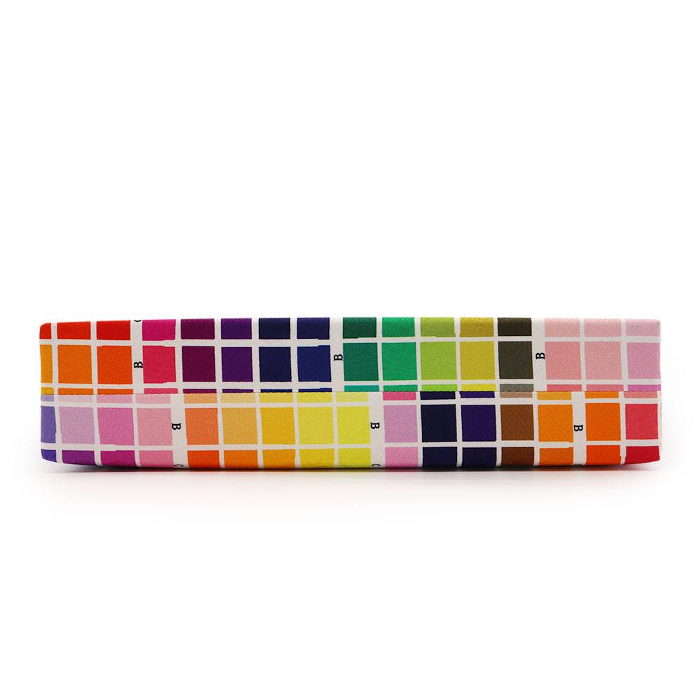 こちらのバッグは、振袖を制作する際に、生地の染まり方を確認するために作られる色見本のデザイン性に着目。カラフルなスクエアがグラデーションで並び、モダンアートのようなポップさとシャープさを持ち合わせた一品となっています。