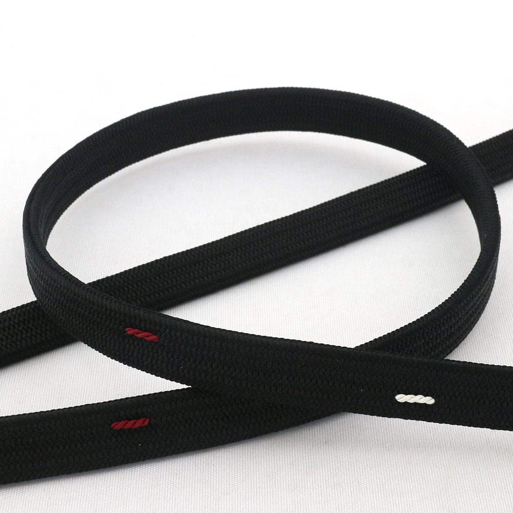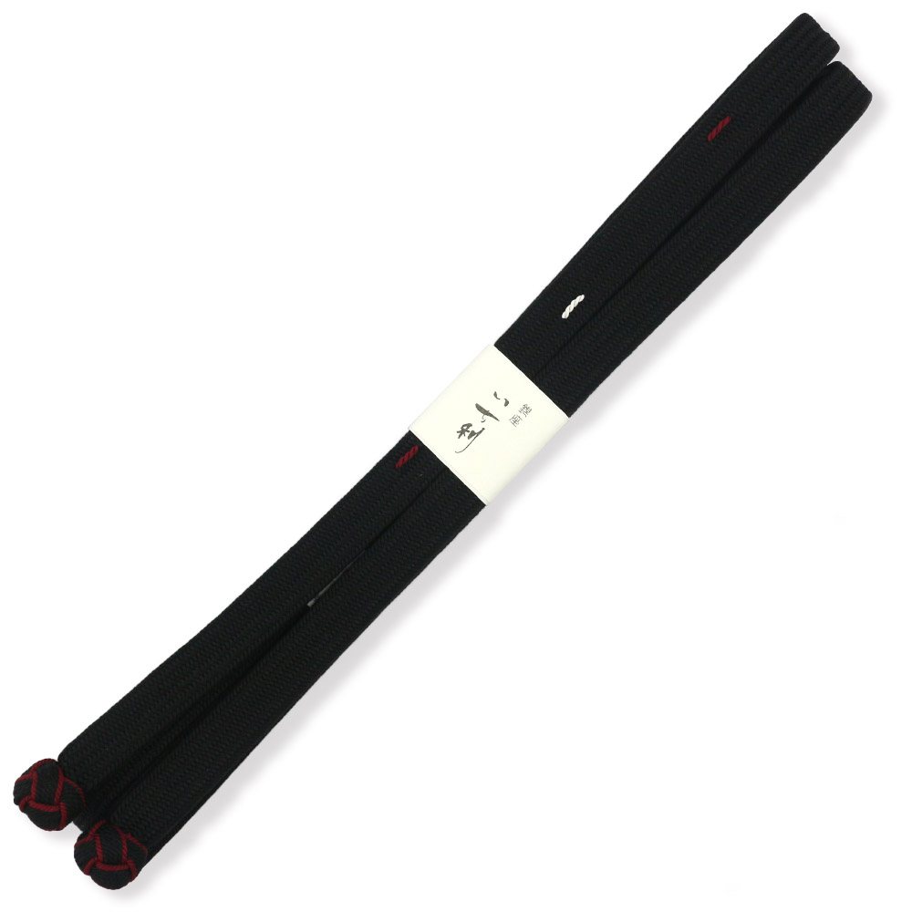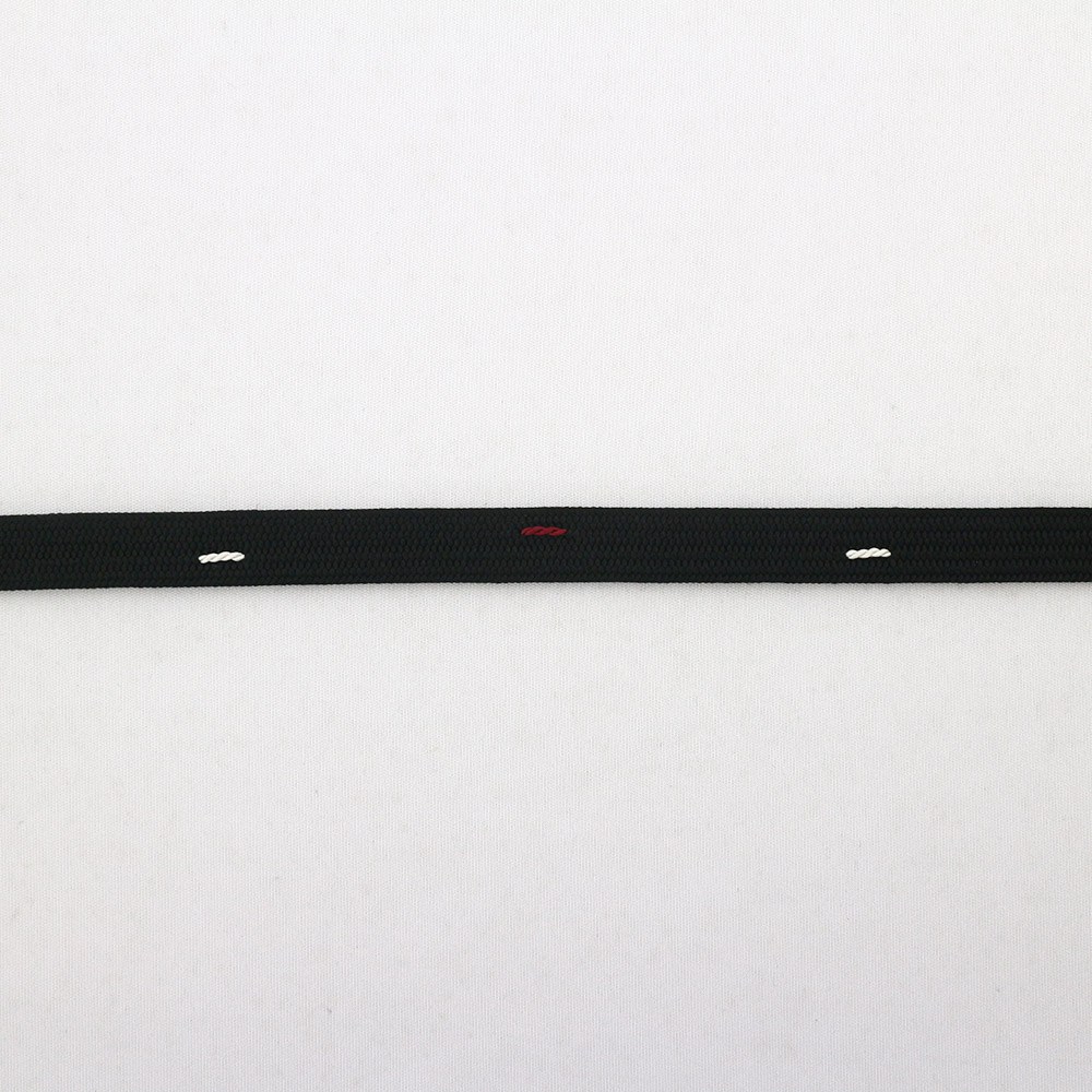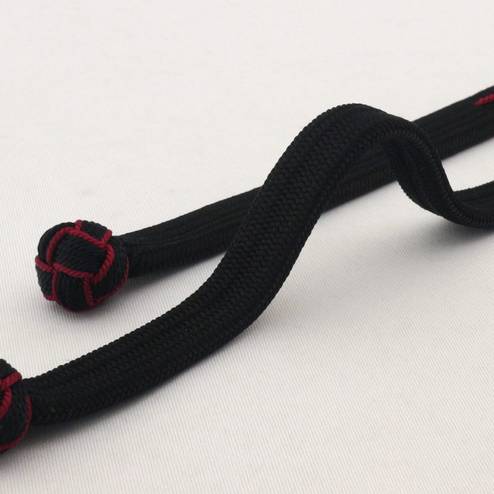 黒色を基調としたしなやかでソフトな角朝組みに、紅白の撚り糸を片方の〆先にだけ組み込んだ遊びゴコロあるデザインです。