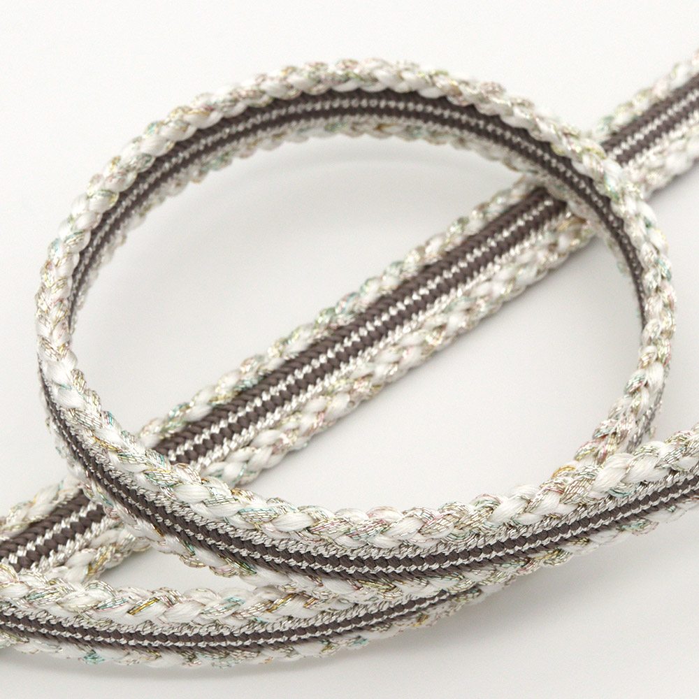 金銀・色々、オーロラカラーの金属糸を両耳に組み込んだ平組みの一本です。