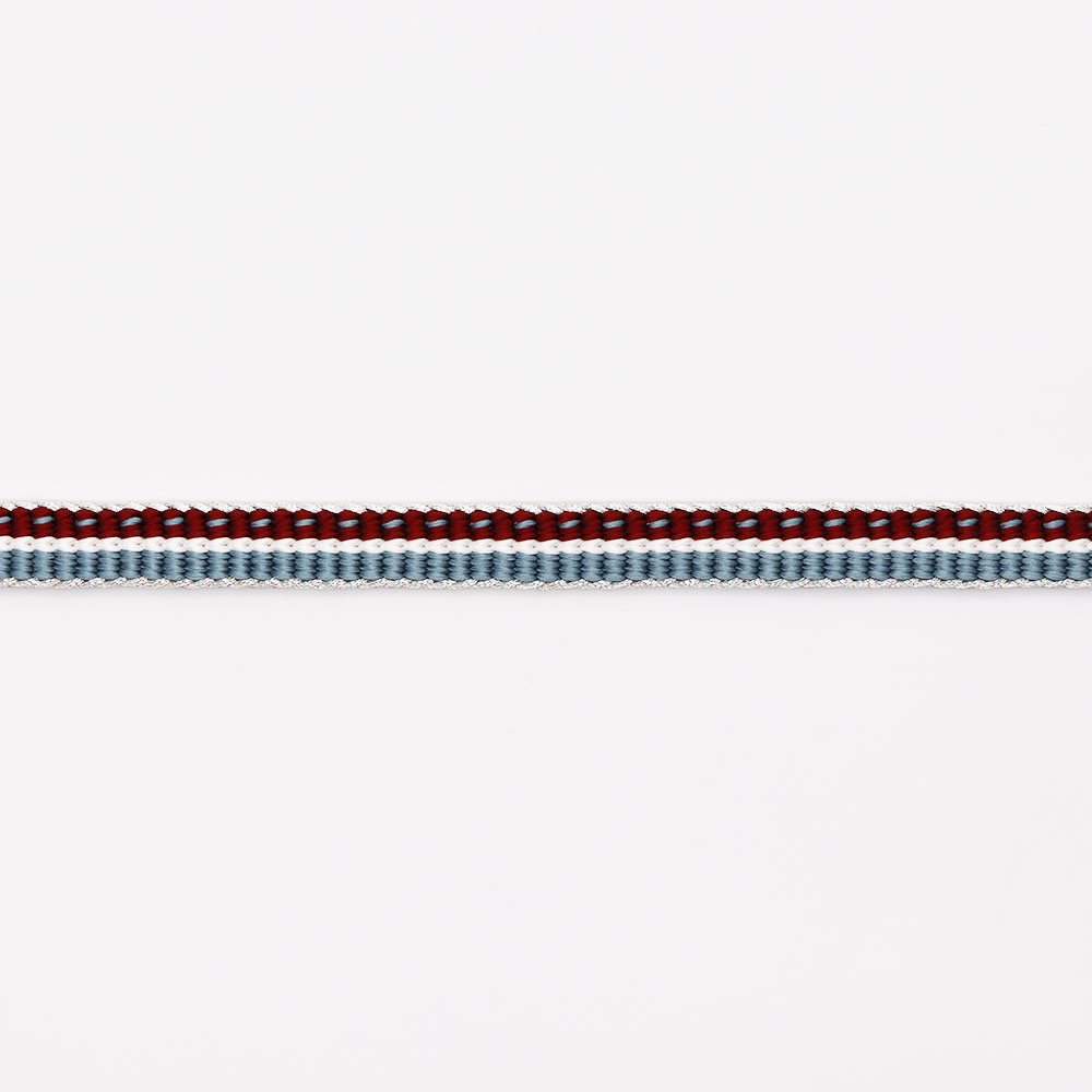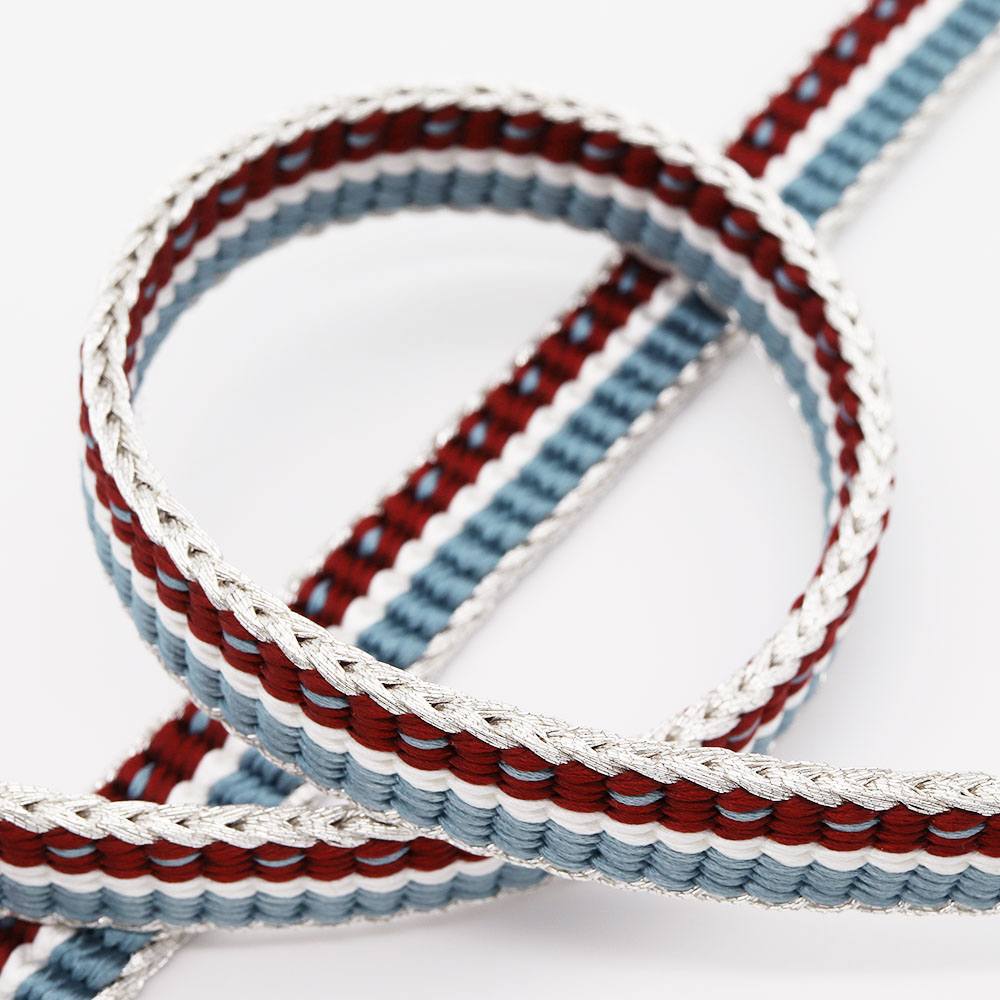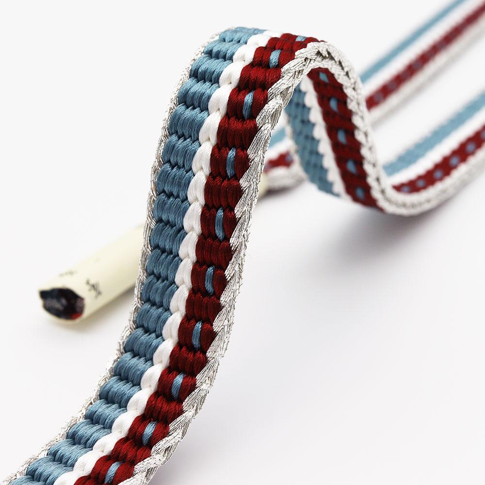 赤と灰青を立別で配し、片側にはステッチのようなアクセントを加えたモダンデザイン。銀糸を組み込み華やかさもあるので、いつものコーデにプラスワンするだけで印象が変化しそうです。