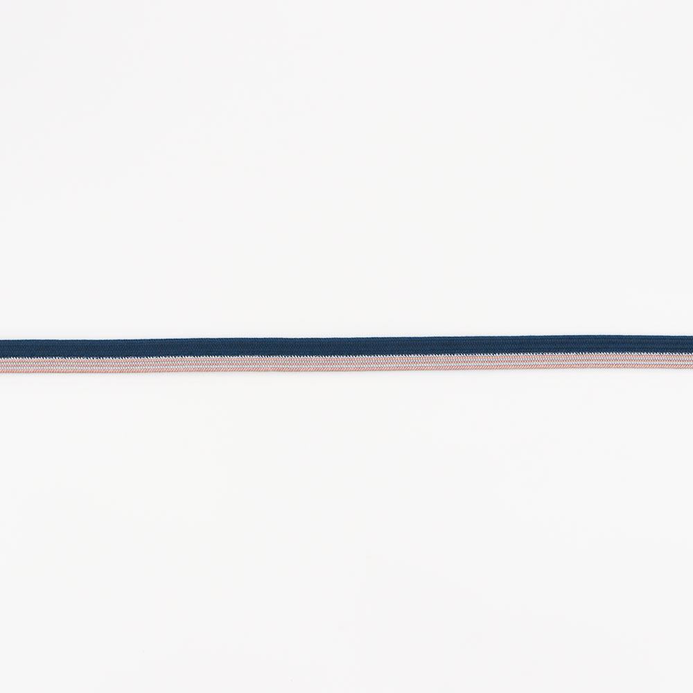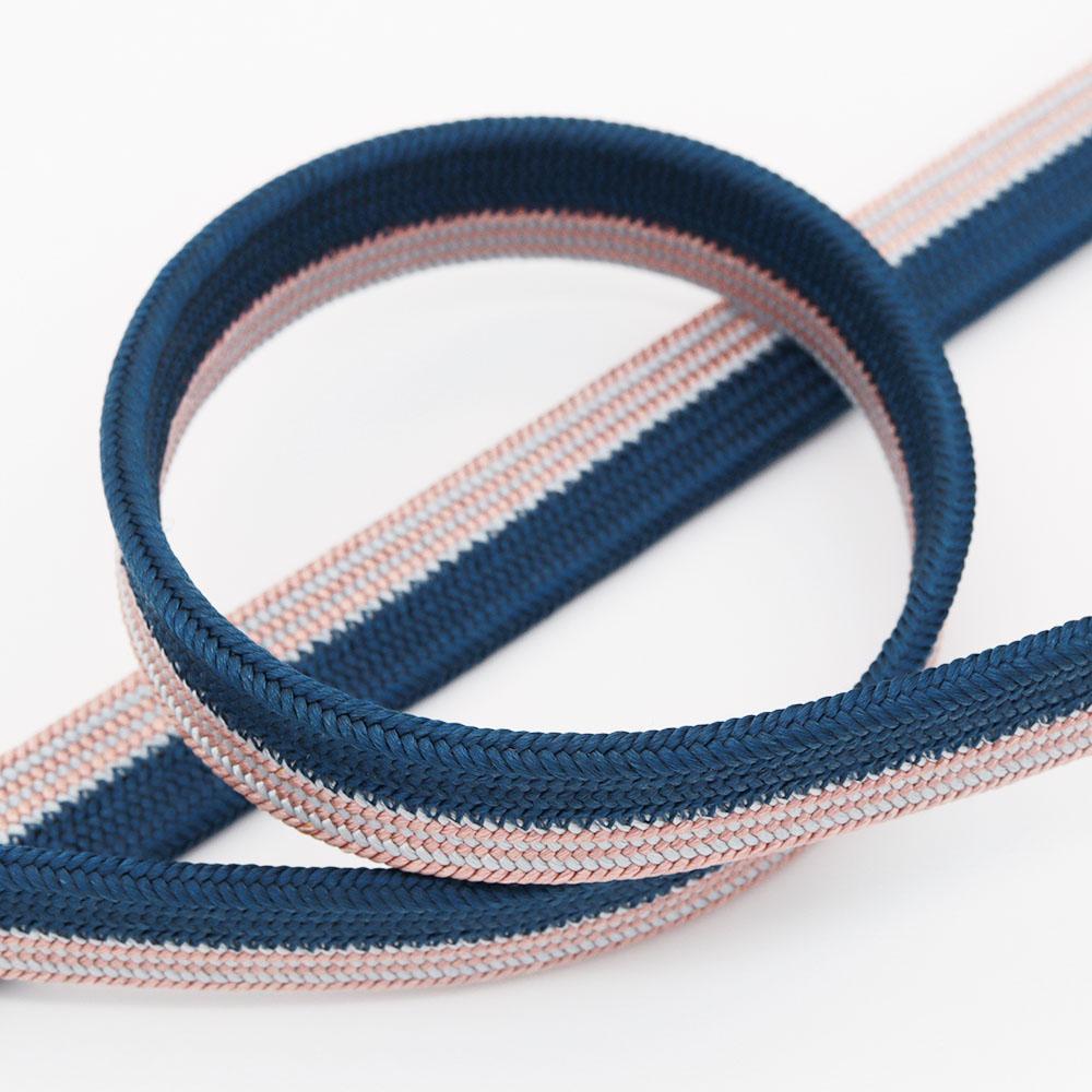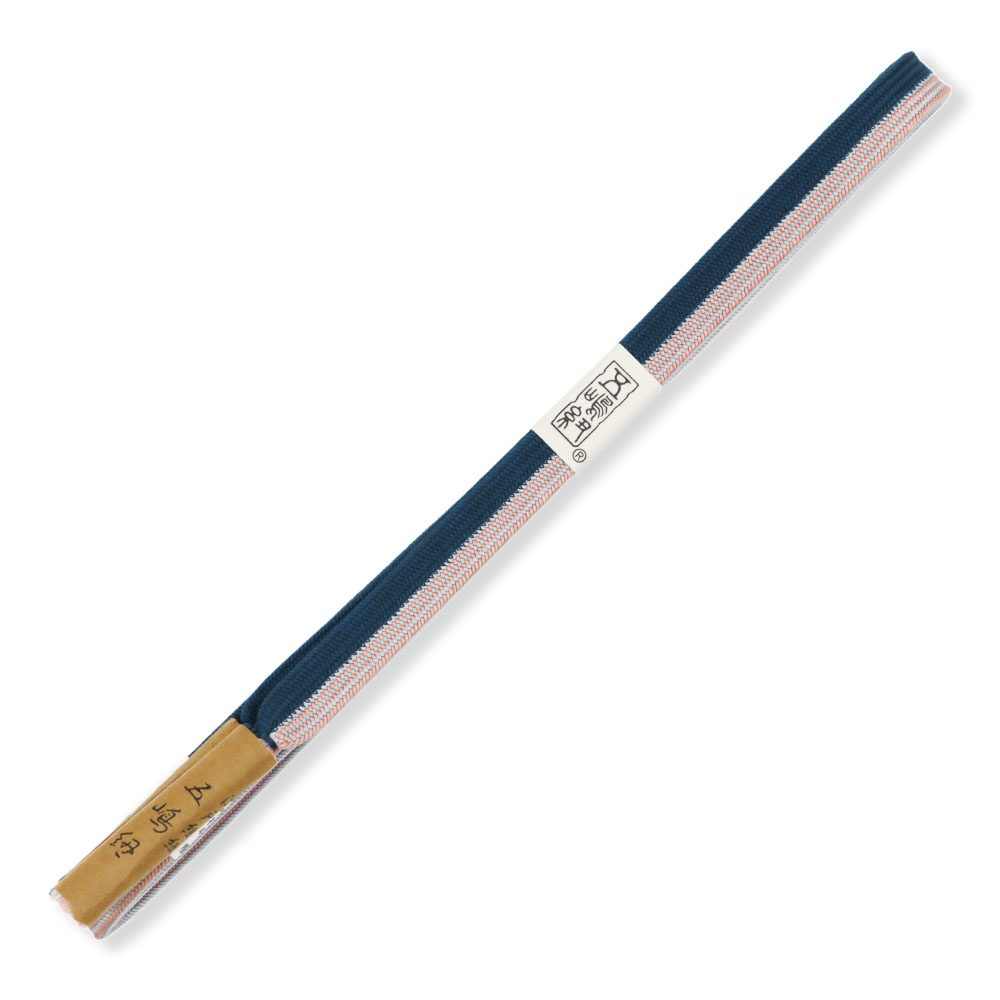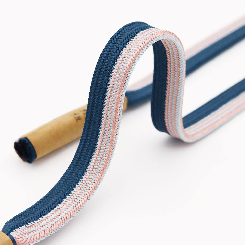 「貝の口のように固い紐」という意味から名付けられた、貝の口組みの一本。濃藍と朱鷺色を立て別けに組み上げ、朱鷺色の方にだけ細縞のアクセントがプラスされています。