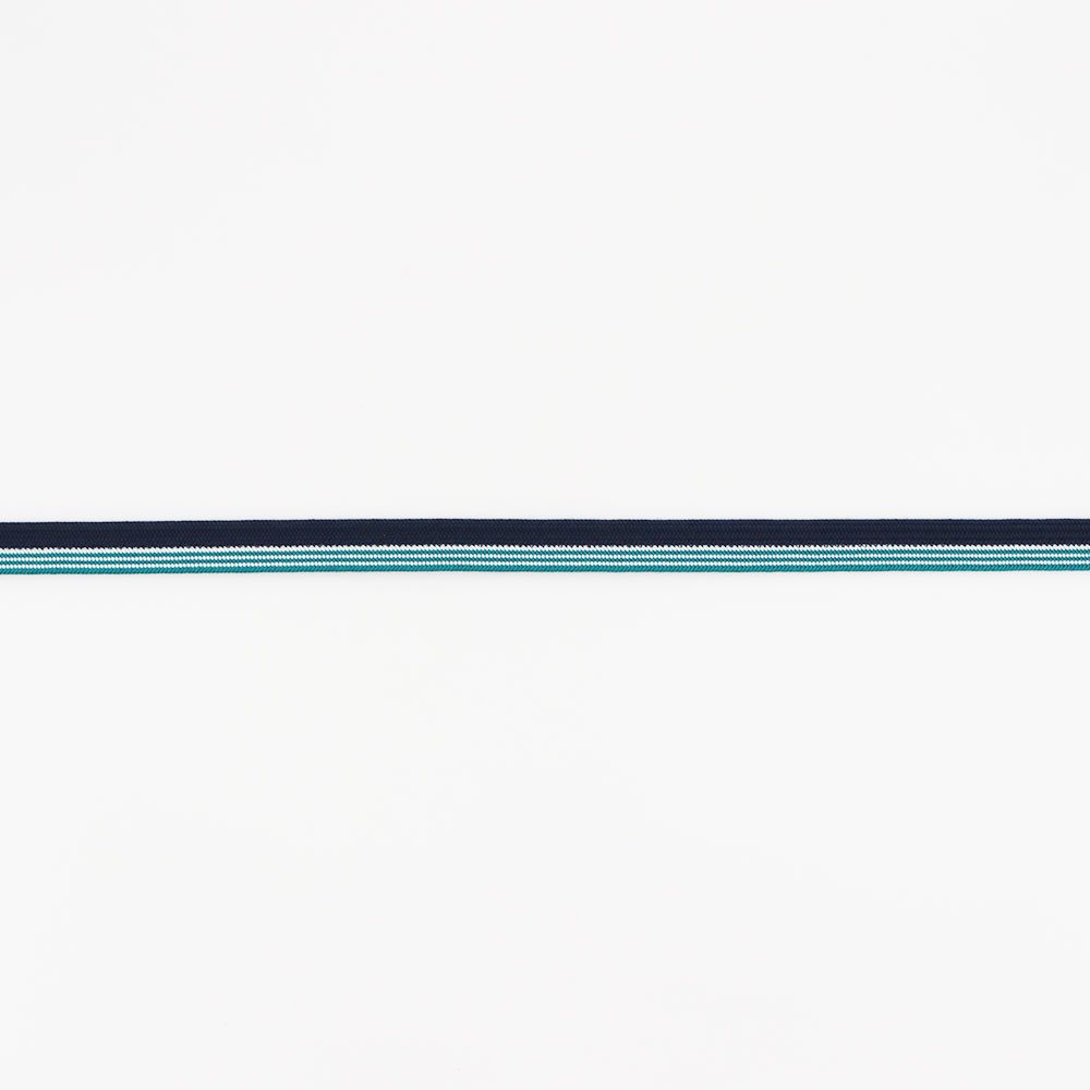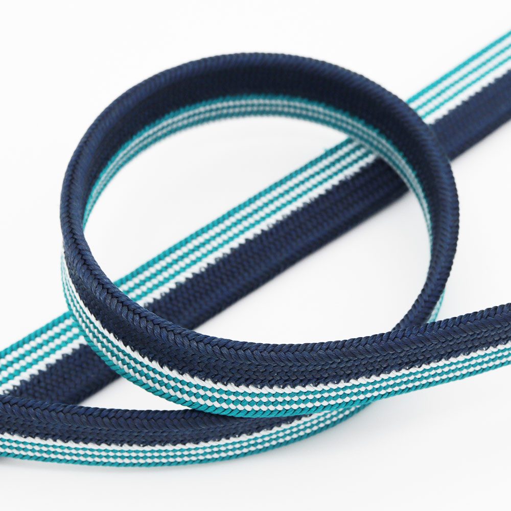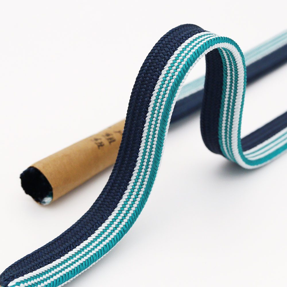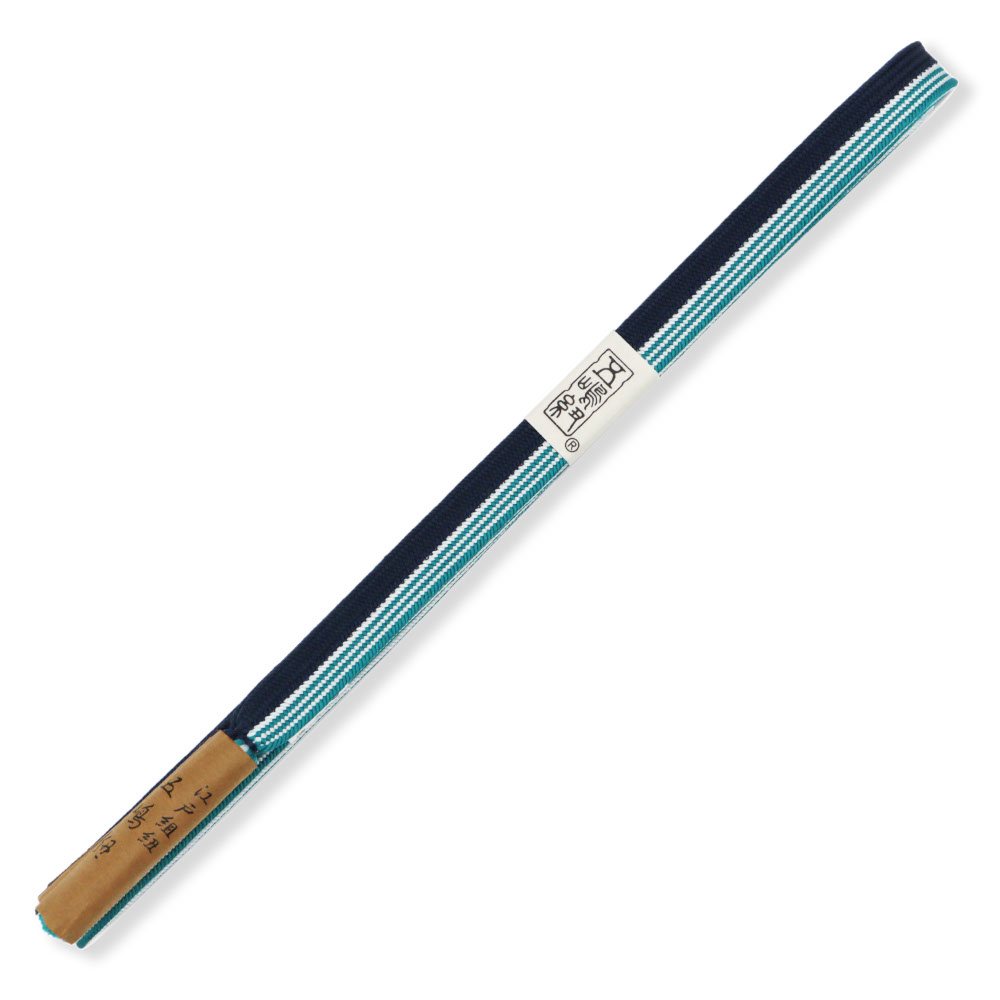 「貝の口のように固い紐」という意味から名付けられた、貝の口組みの一本。紺鼠と青緑色を立て別けに組み上げ、青緑色の方にだけ細縞のアクセントがプラスされています。