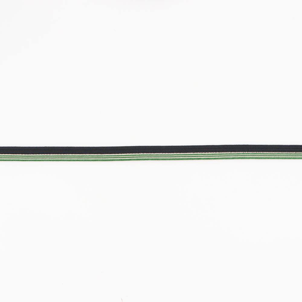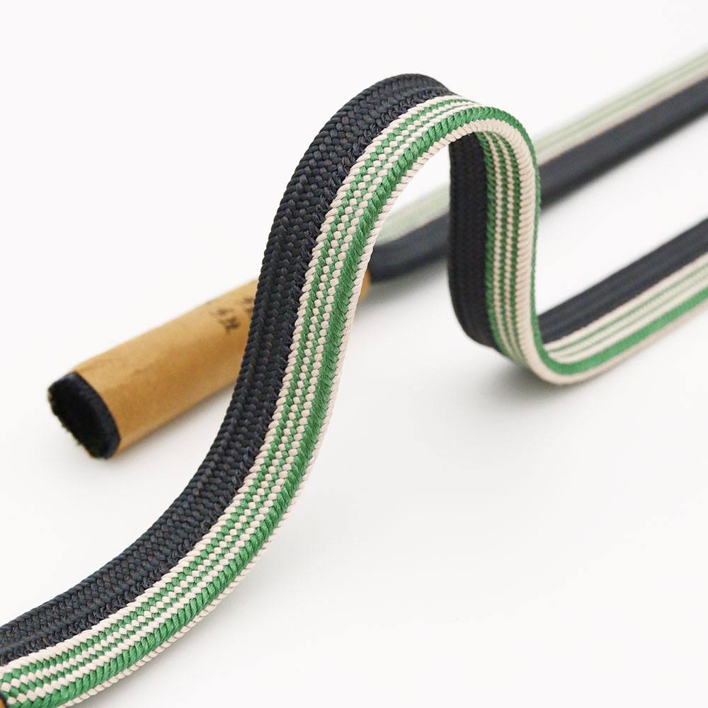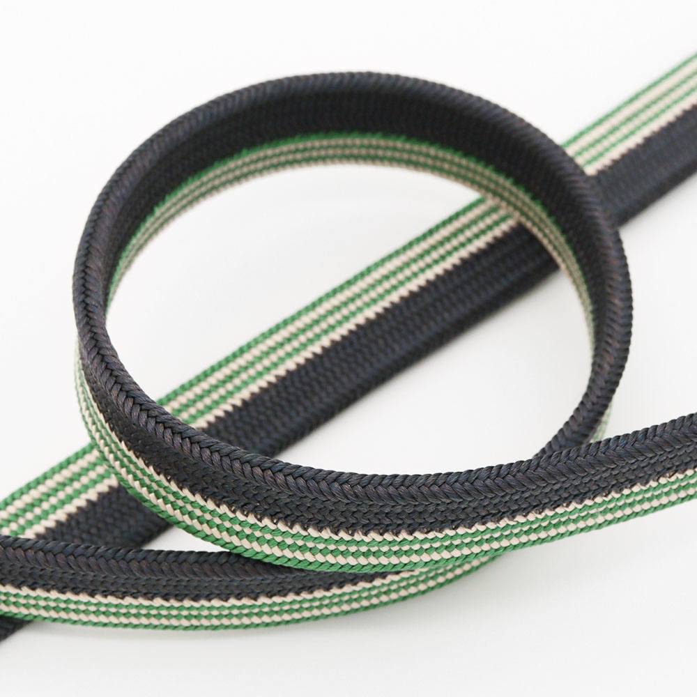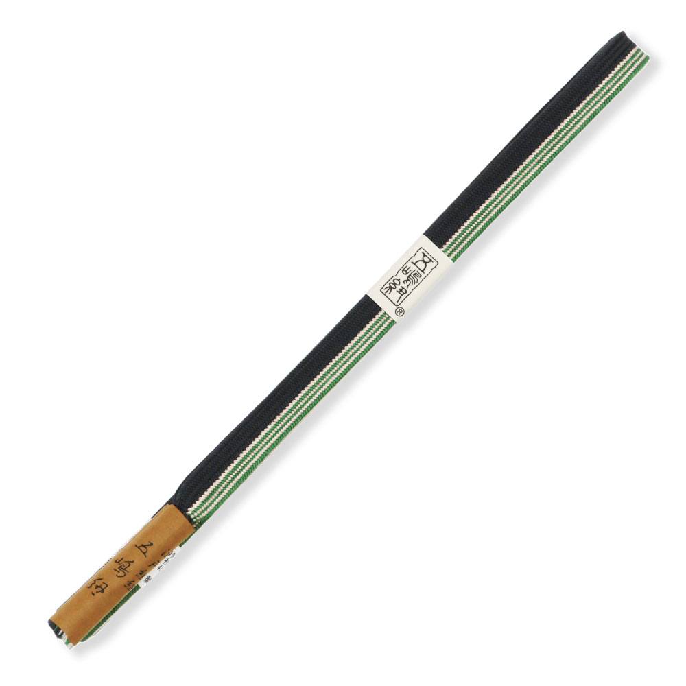 「貝の口のように固い紐」という意味から名付けられた、貝の口組みの一本。濃灰と緑色を立て別けに組み上げ、緑色の方にだけ細縞のアクセントがプラスされています。