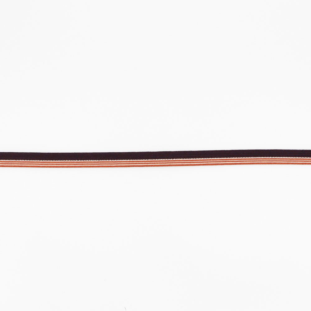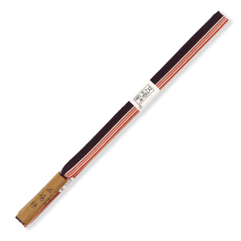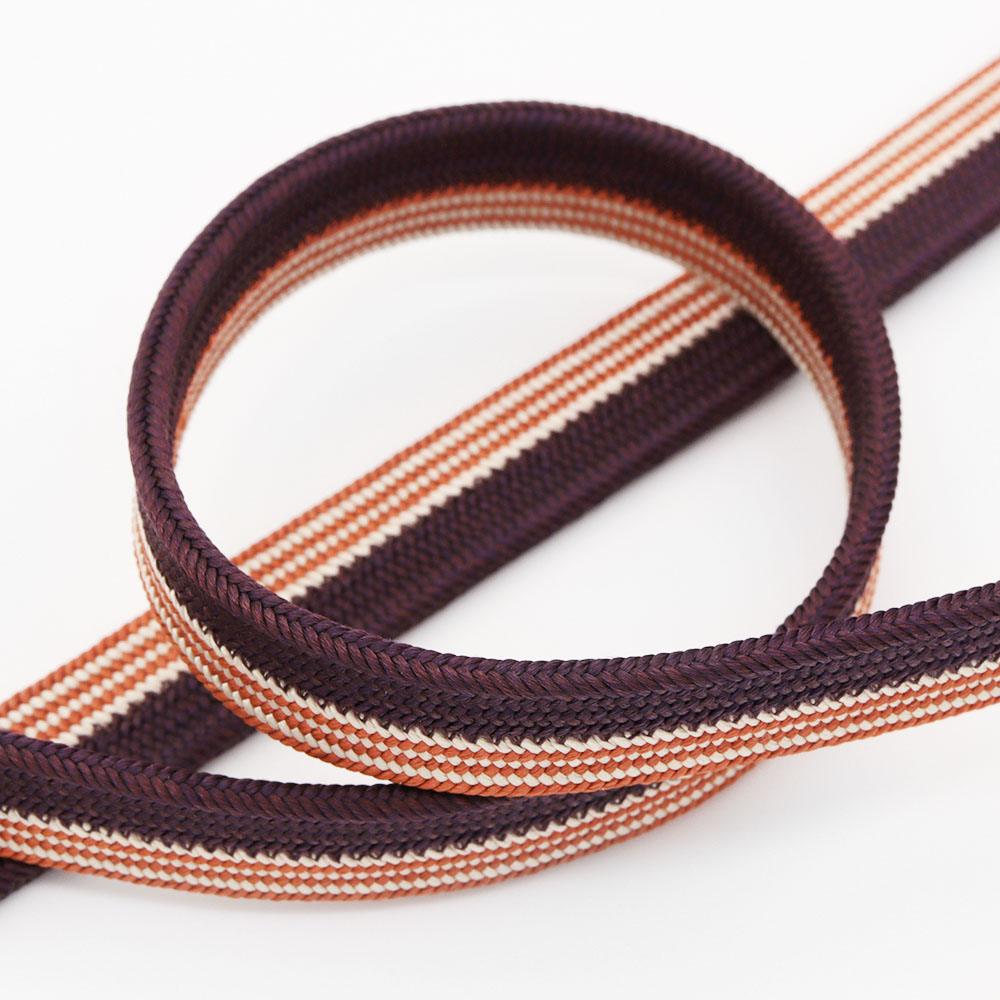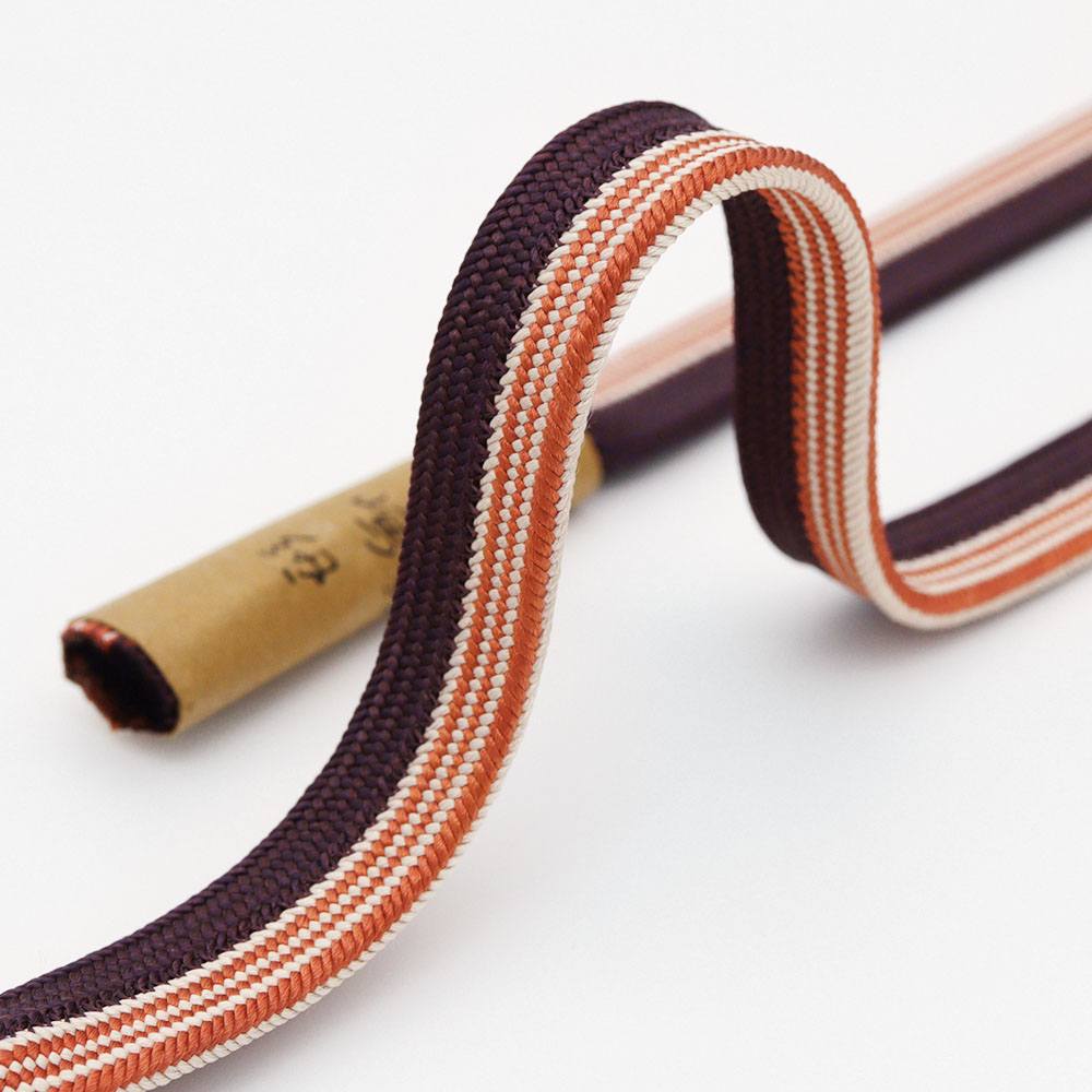 「貝の口のように固い紐」という意味から名付けられた、貝の口組みの一本。濃茶と橙色を立て別けに組み上げ、橙色の方にだけ細縞のアクセントがプラスされています。