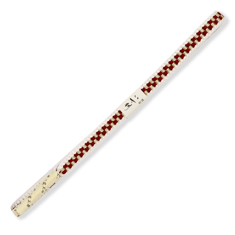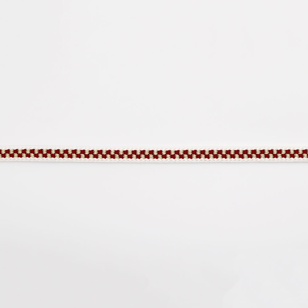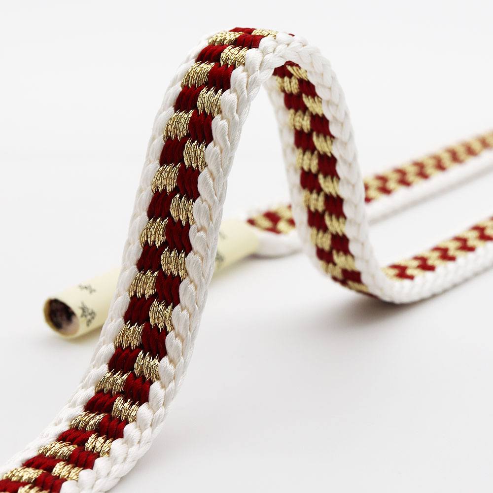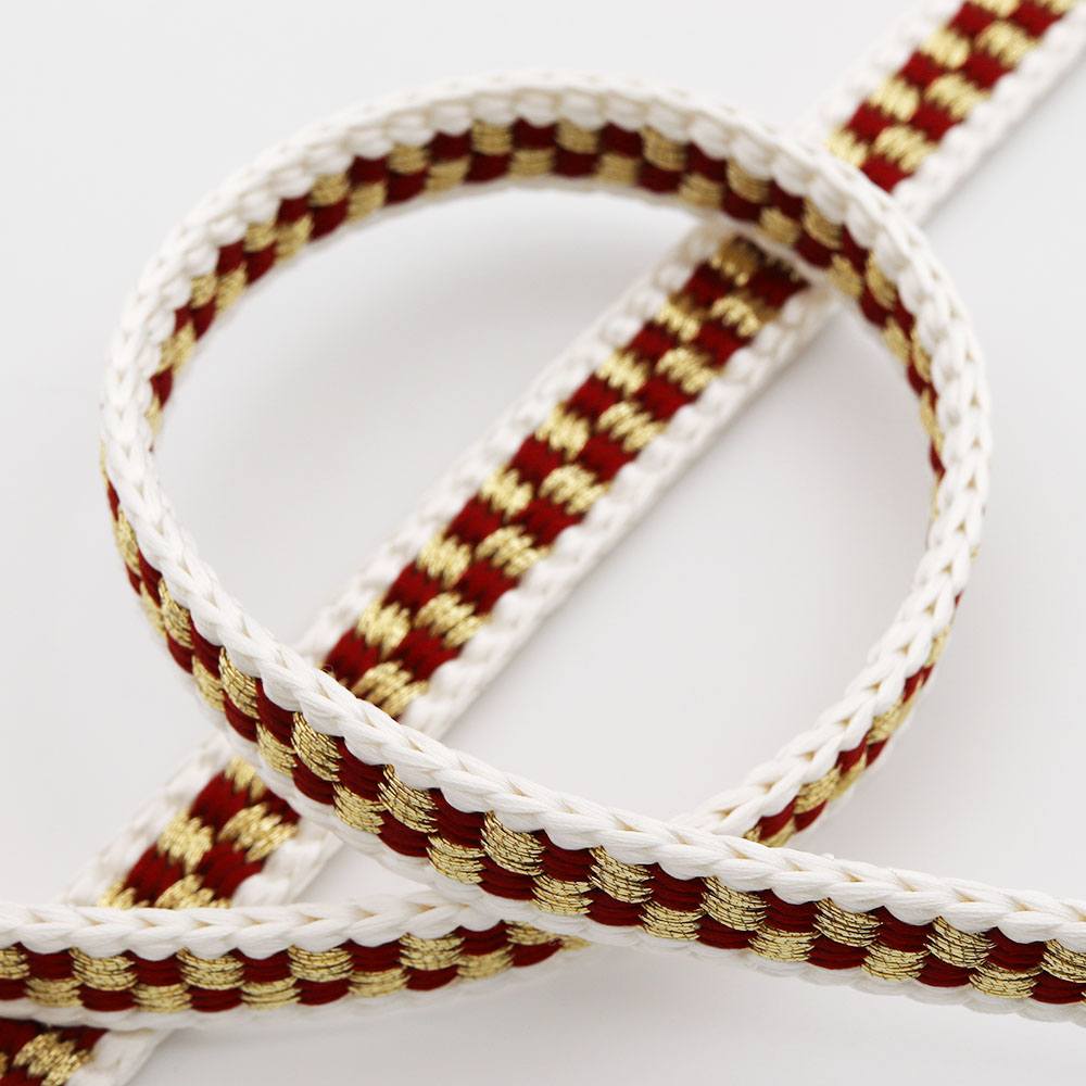 白で組まれた外枠の中に、濃赤と金の市松模様を組んだ華やかな帯締です。しなやかな仕上がりなので手に馴染んで結びやすく、帯周りを支えてくれるしっかりさもポイント◎お手入れが簡単で丈夫な撚り房なので、長く使うことができるのも嬉しいですね。