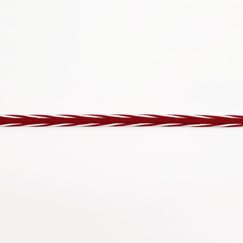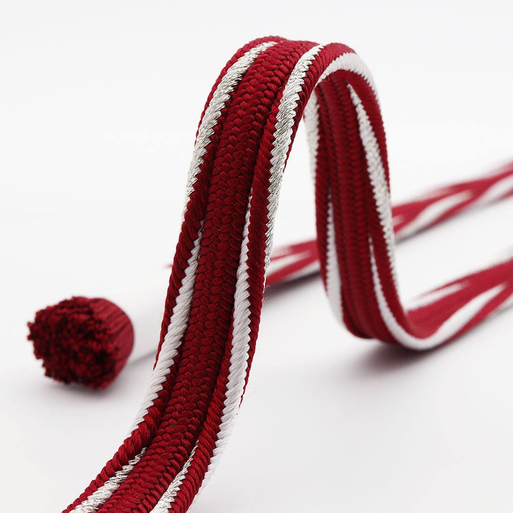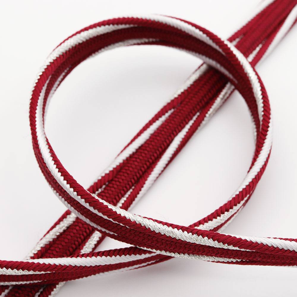センターに平唐組み、その両サイドにボリューム感のある洋角組みを配したデザイン性の高い一本です。赤と銀糸を基調とした紐をひねりながら矢羽のような柄行きを表現。ひねりをかけることによって綺麗な曲線を描き、織り込まれた銀糸がきらめく華やかな仕上がりになっています。