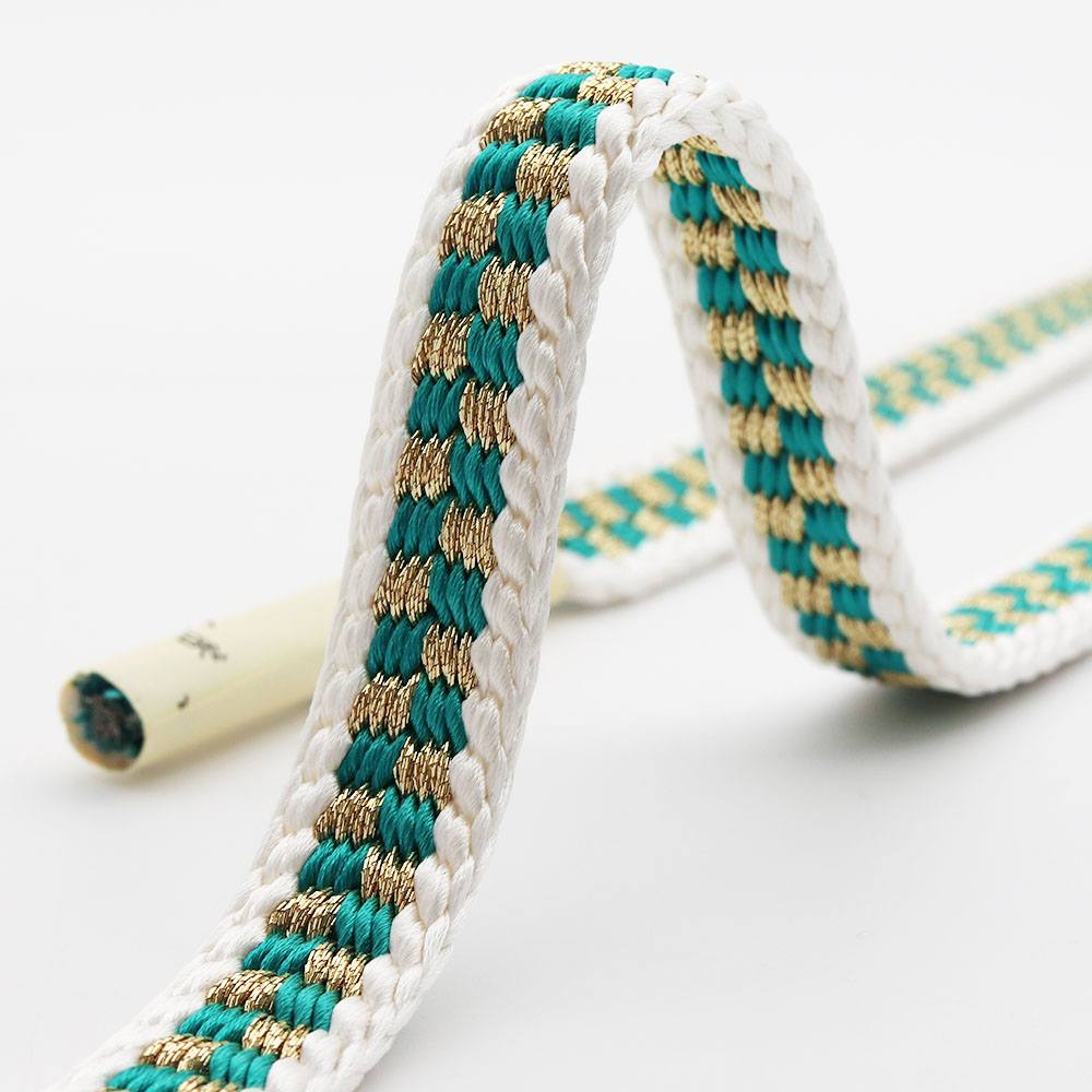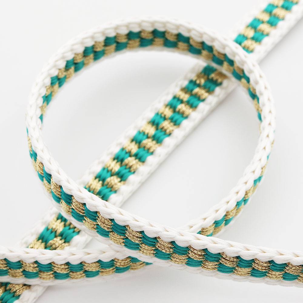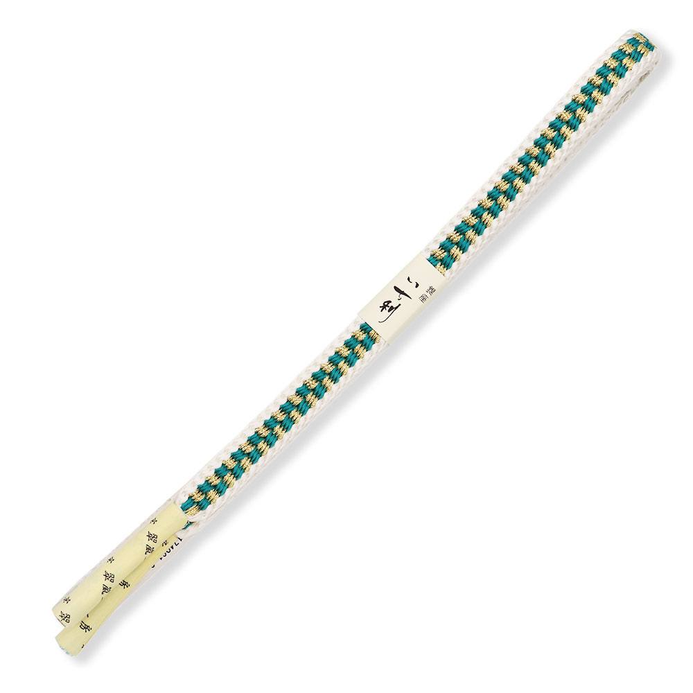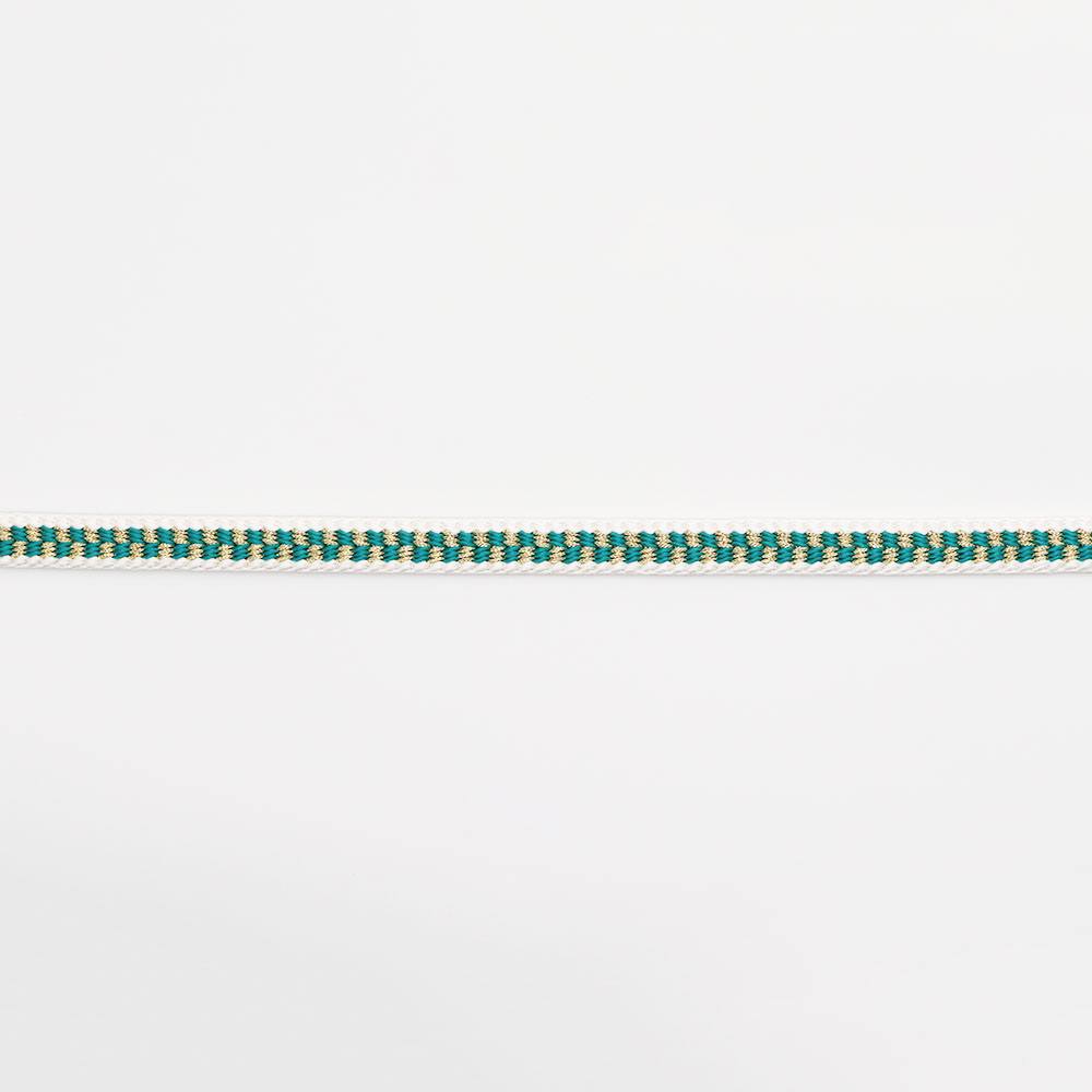 白で組まれた外枠の中に、青緑と金の市松模様を組んだ華やかな帯締です。しなやかな仕上がりなので手に馴染んで結びやすく、帯周りを支えてくれるしっかりさもポイント◎お手入れが簡単で丈夫な撚り房なので、長く使うことができるのも嬉しいですね。