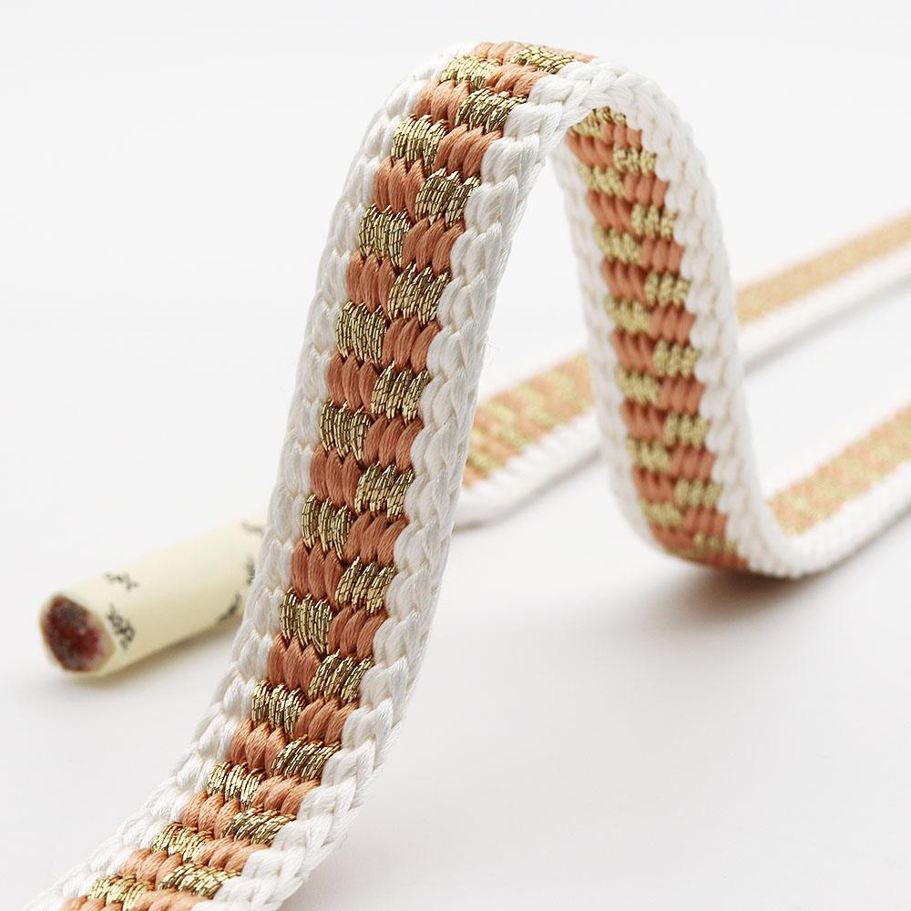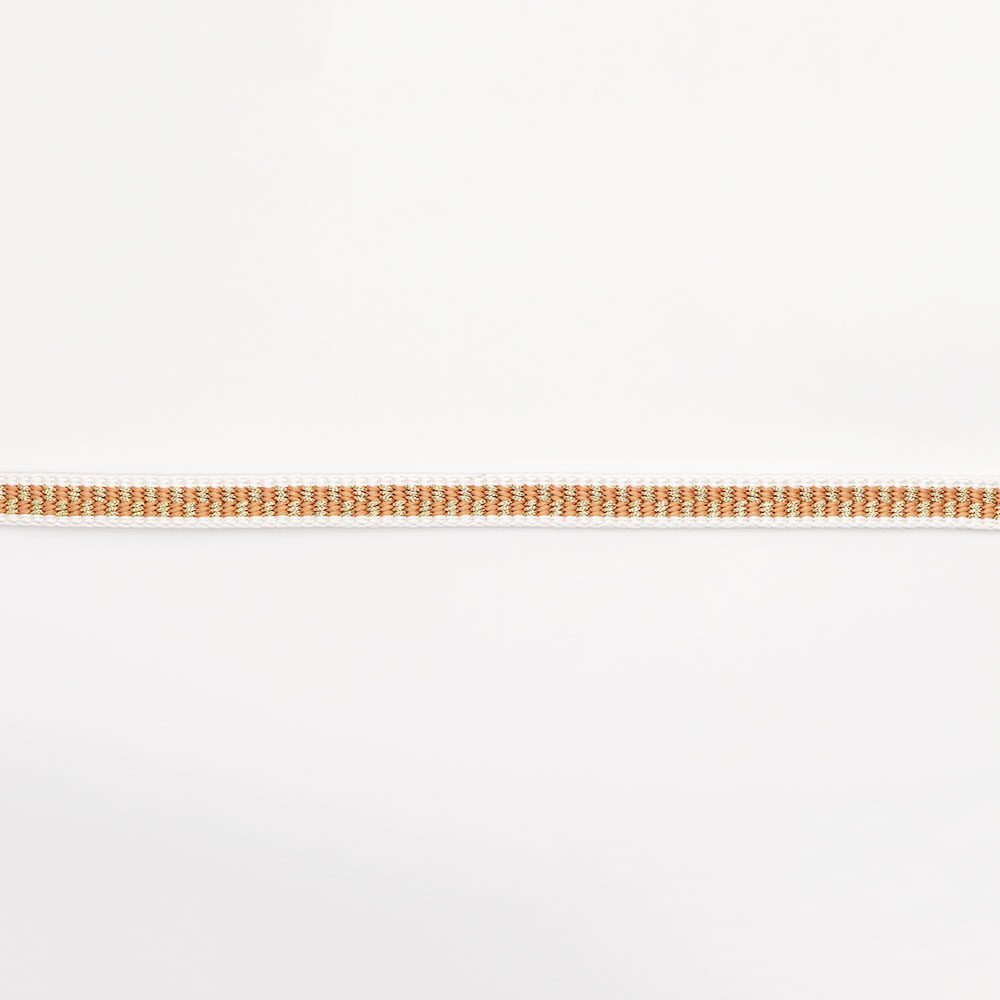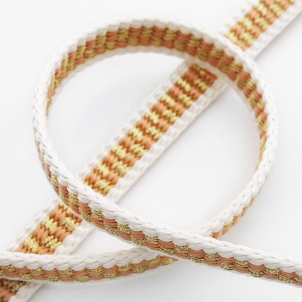 白で組まれた外枠の中に、橙色と金の市松模様を組んだ華やかな帯締です。しなやかな仕上がりなので手に馴染んで結びやすく、帯周りを支えてくれるしっかりさもポイント◎お手入れが簡単で丈夫な撚り房なので、長く使うことができるのも嬉しいですね。