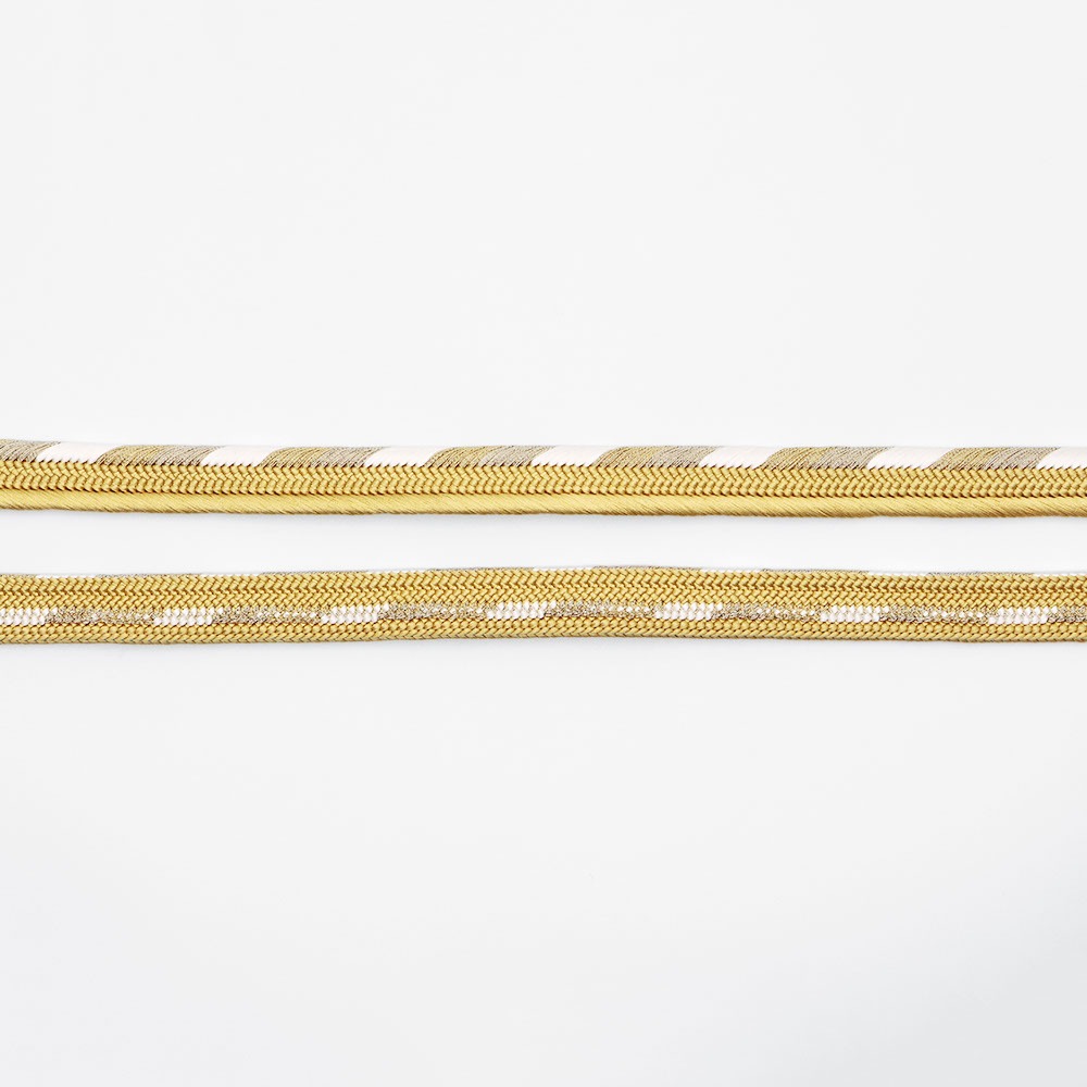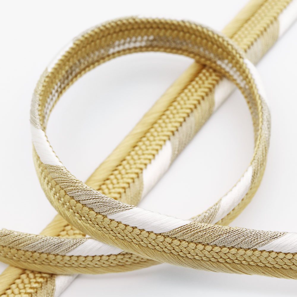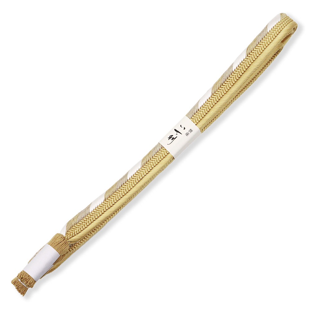 立体感のある組み目が特徴の平組みに、片胴に白のアクセントを加えたシンプルなデザイン。薄黄×白のツートンカラーが帯周りのアクセントや引き締め役として活躍してくれるでしょう。