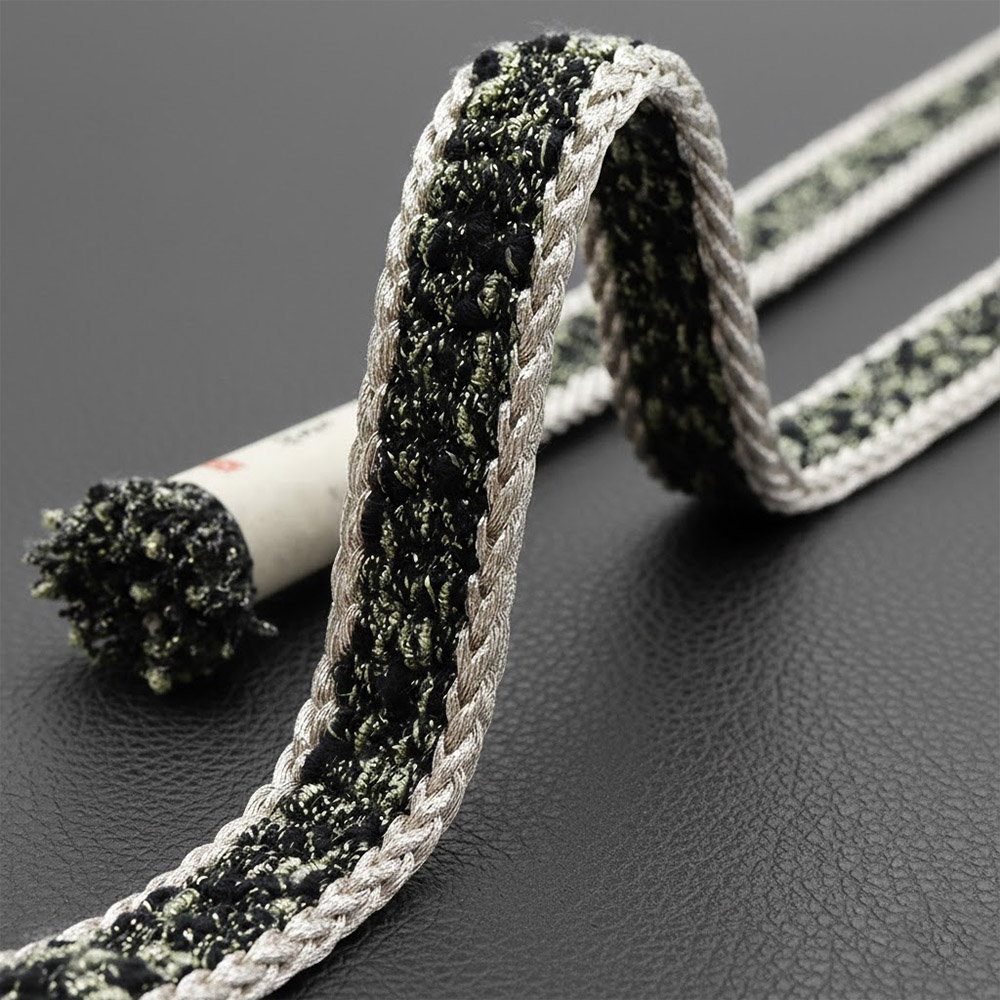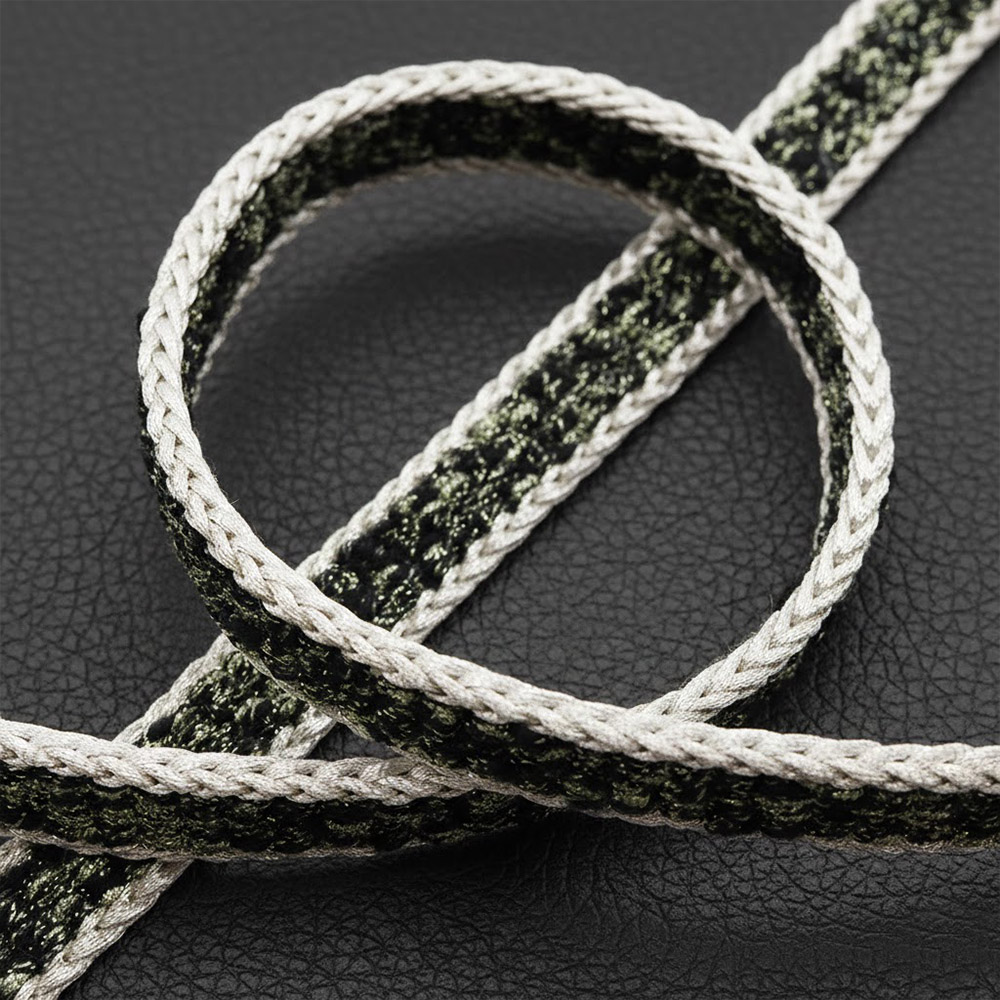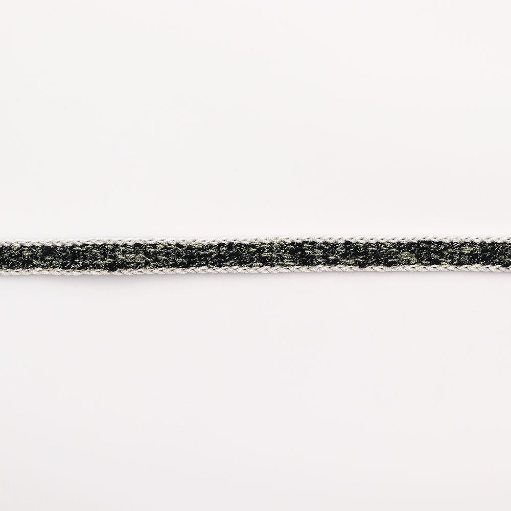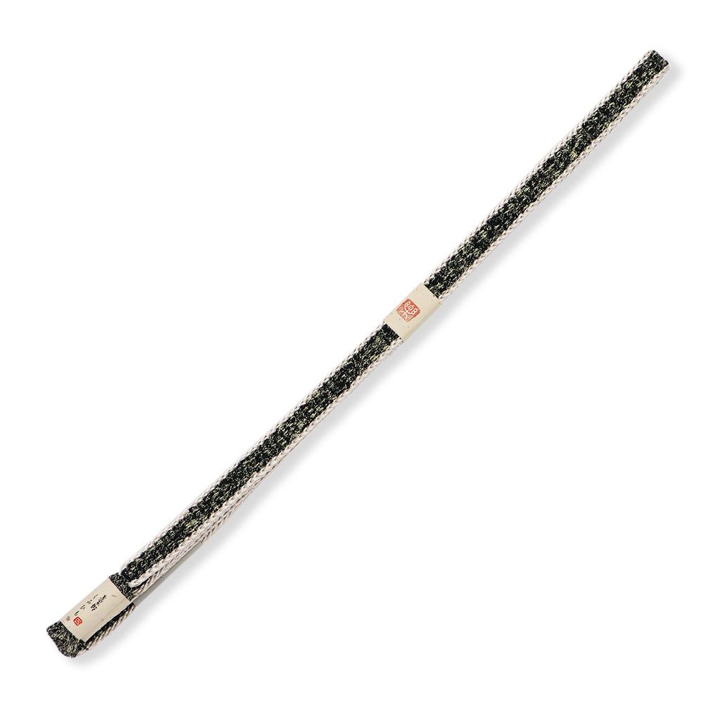 金・銀糸に白と黒緑色の糸を撚り合わせて組み上げた平組み帯締。