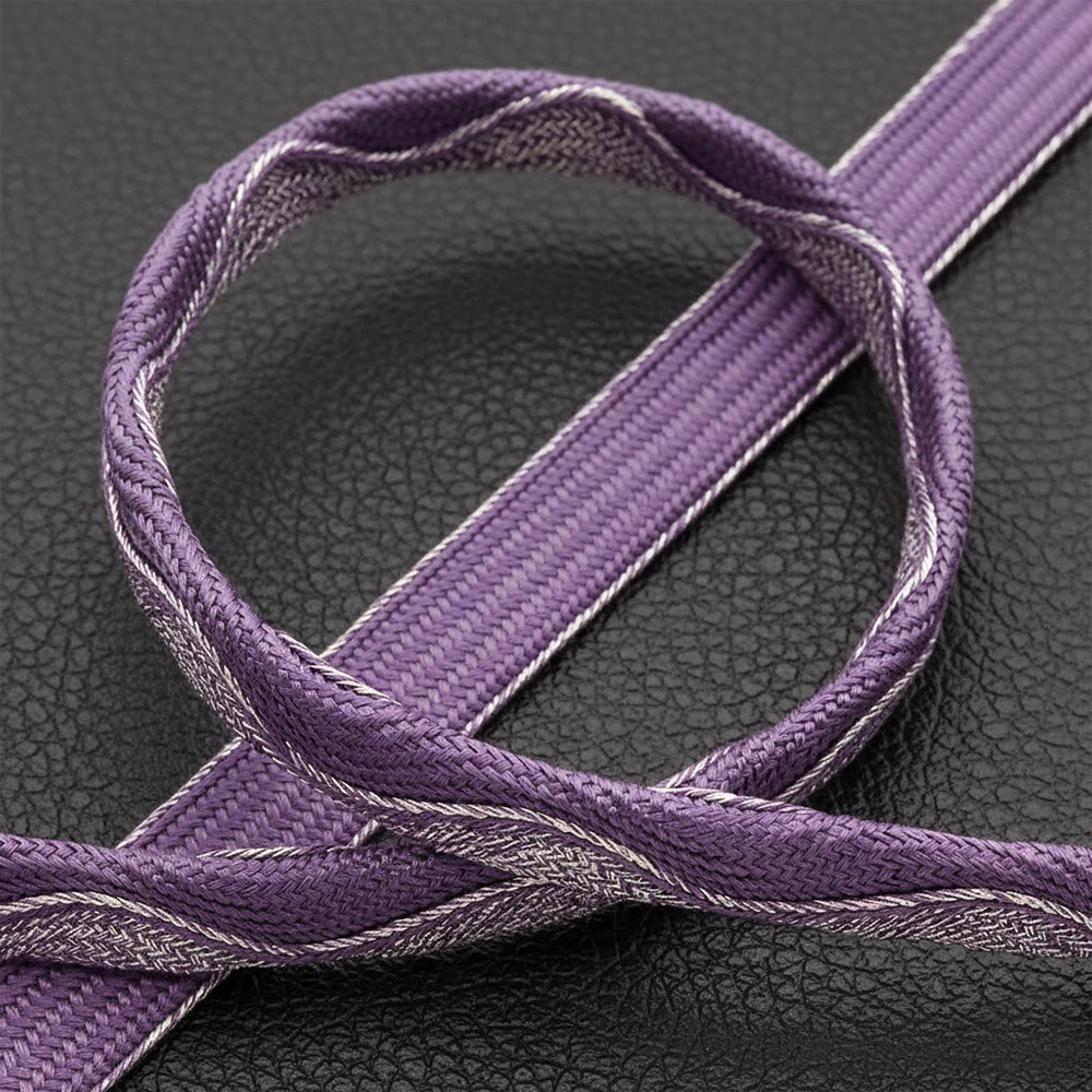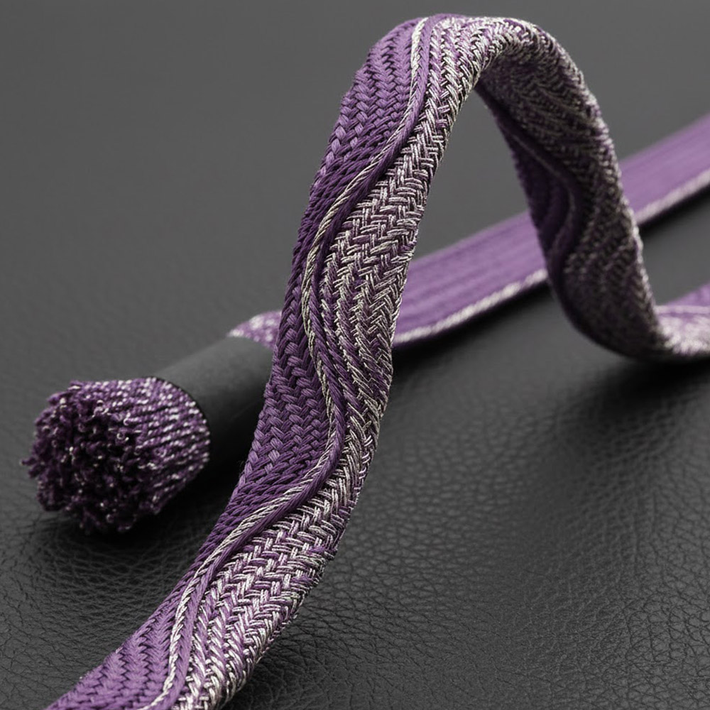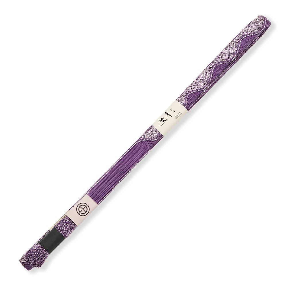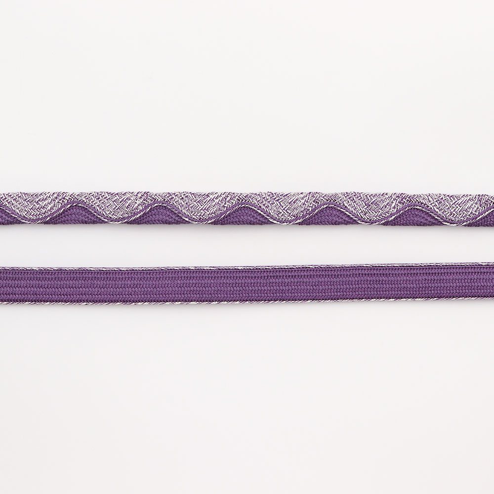 「貝の口のように固い紐」という意味から名付けられた貝の口組みに、立体的なよろけ模様を片胴に組み上げた一本。銀糸をたっぷりと使った面はきらめきあふれるデザイン、そうでない面は鮮やかな藤色をメインにお楽しみいただけるデザインになっています。