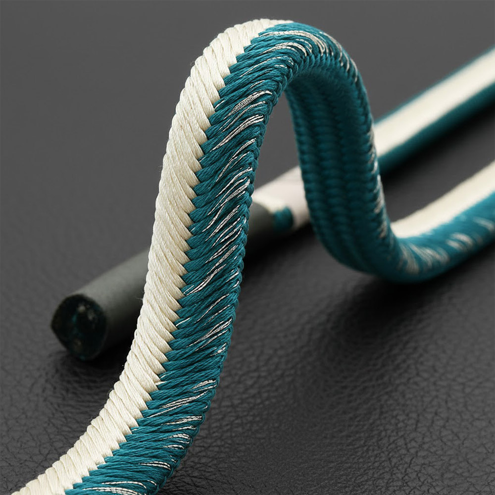 絹光美しい洋角組みに、角朝組みを合わせた変わり組みの一本。生成と納戸色に、片側を銀糸で彩ったアシンメトリーデザインで、派手すぎずも華やかさを忘れない仕上がりになっています。