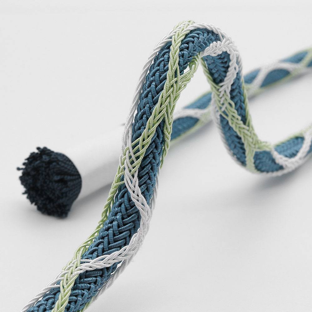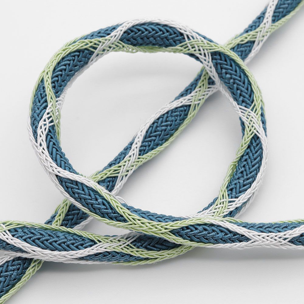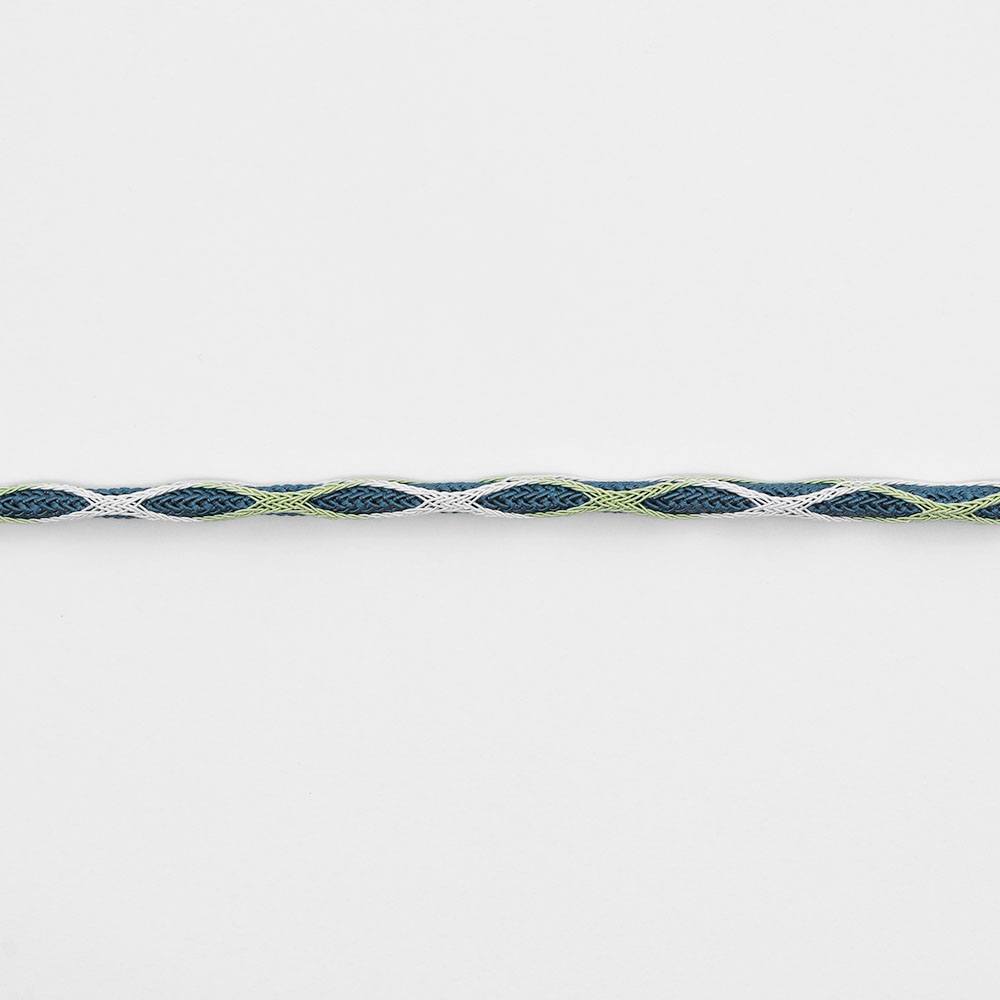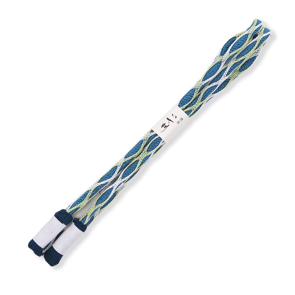青色の丸唐組みの外側に、薄緑色と白を交互に混ぜた組糸を籠目で巻き付けた遊びのある一本です。