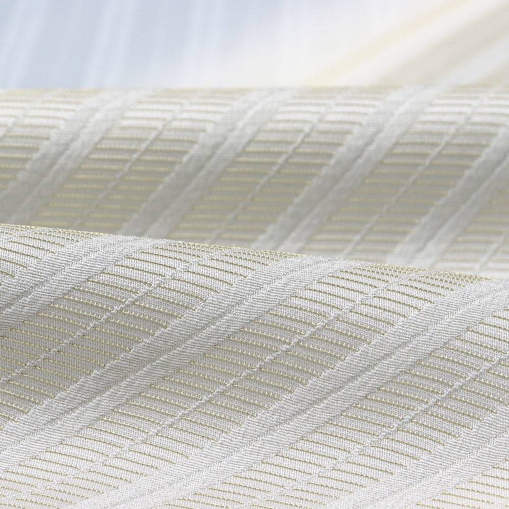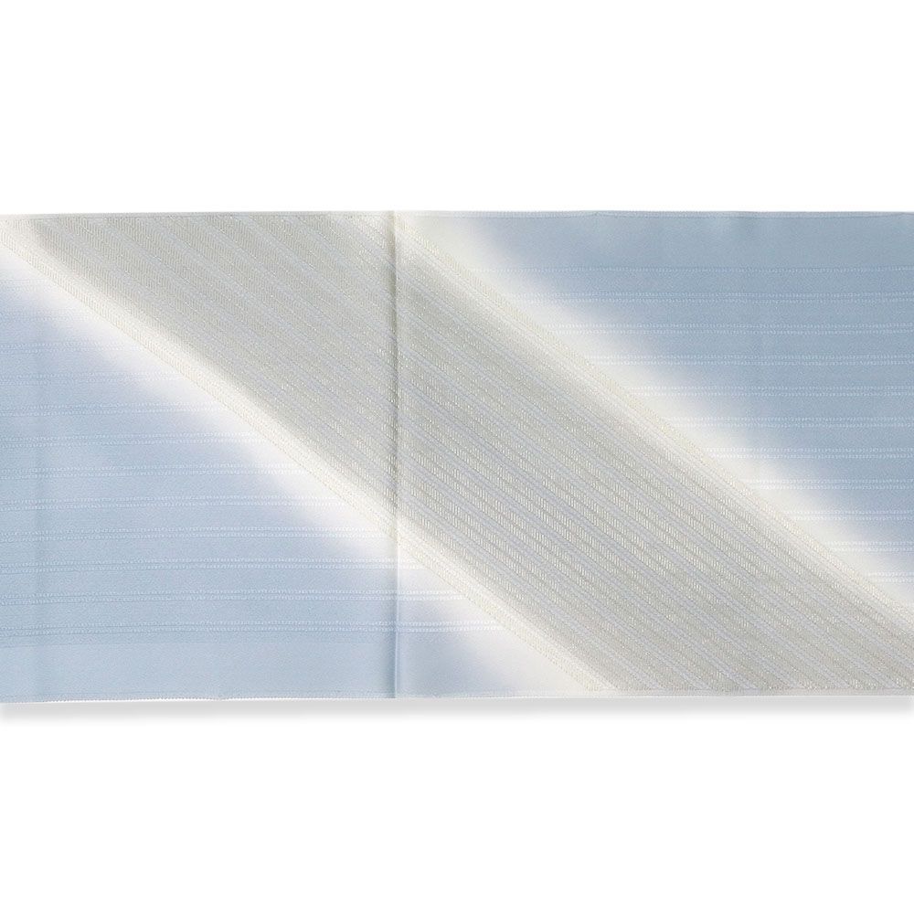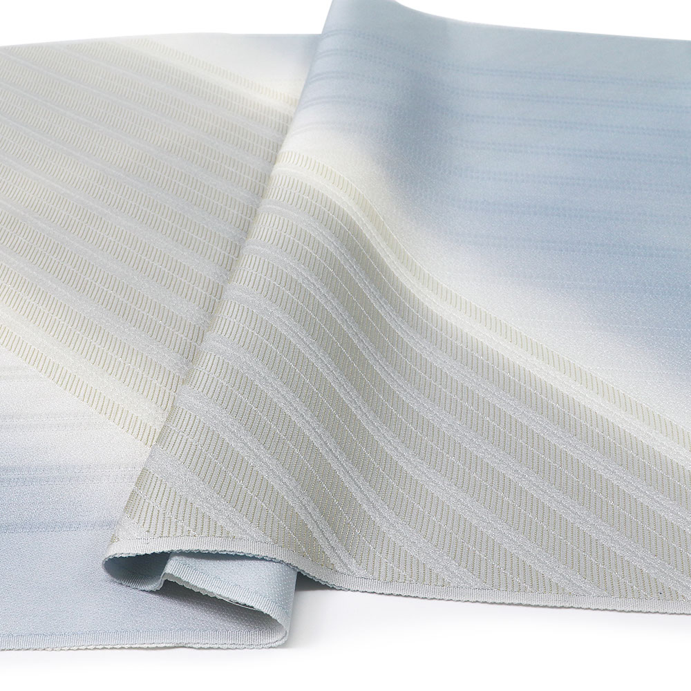 しなやかなハリのある正絹地に、薄灰と薄青の斜めぼかしを染めた一枚。織り込まれた金糸のきらめきと、ハリのある質感が淡色カラーリングとあいまってふんわり優しい仕上がりになっています。
